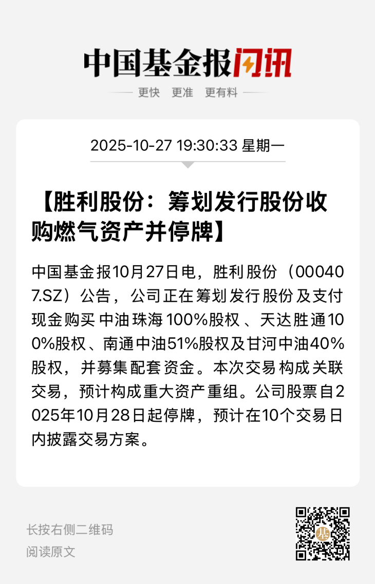 据悉,本次交易构成关联交易,预计构成重大资产重组。本次交易不会导致公司实际控制人发生变更, 不构成重组上市。因有关事项尚存不确定性,经公司申请,公司证券自2025年10月28日(星期二)开市起 开始停牌;公司预计在不超过10个交易日的时间内披露本次交易方案。 其中,天达胜通通过旗下子公司中油燃气(珠海)投资有限公司("珠海投资")间接控制甘河中油40%股权 及南通中油49%股权,因此本次交易完成后公司将合计持有中油珠海100%股权、天达胜通100%股权, 合计控制甘河中油80%股权、南通中油100%股权。 智通财经APP讯,胜利股份(000407.SZ)公告,公司正在筹划发行股份及支付现金购买由公司控股股东及 其关联方控制的燃气类相关资产并募集配套资金事项("本次交易"),交易标的包括由中油燃气投资集团 有限公司("中油投资")持有的中油燃气(珠海横琴)有限公司("中油珠海")100%股权、天达利通新能源(珠 海)有限公司("天达利通")持有的天达胜通新能源(珠海)有限公司("天达胜通")100%股权以及由中油中泰 燃气投资集团有限公司("中油中泰")持有的南通中油燃气有限责任公司("南通中油")51%股权、 ...