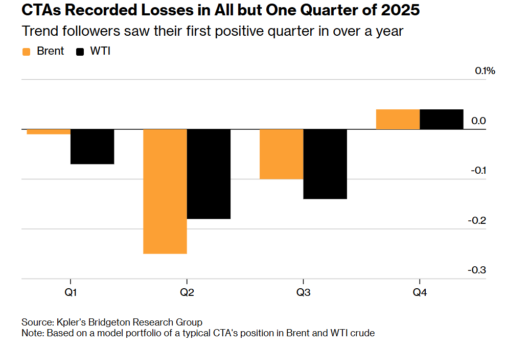CTA行业在2025年面临的挑战与表现 - 2025年商品交易顾问遭遇史上最长的连续年度亏损,主要因关税、地缘政治动荡导致市场缺乏清晰方向性信号[1] - 2025年约80%的交易周里,CTA都在调整其美国原油持仓,持仓保持稳定的交易周较少且多集中在四季度[4] - 2025年大部分时间,受反复无常的贸易政策和中东冲突影响,CTA难以把握市场趋势,市场存在震荡价格区间、虚假突破和快速反转的信号[4] 2025年第四季度的短暂盈利与持仓变化 - 2025年末,市场对原油供应过剩的共识增强,为CTA提供了明确信号,使其难得实现了单季度盈利[4] - 年末的盈利势头推动CTA加大了对WTI原油近月合约的布局,这放大了市场波动率[4] - CTA在WTI原油近月合约日均成交量中的占比,在2025年仅为15%至25%[5] 2026年初的市场环境与策略调整 - 2026年1月以来,CTA的收益小幅为负,地缘政治波动再次带来挑战[5] - 本月初,CTA的持仓从净空转为净多,押注新一轮牛市趋势[5] - 普勒预计,到2026年,在油价大幅波动期间,CTA在WTI原油近月合约日均成交量中的占比将升至35%[5] 2025年不同交易品种的表现分化 - 2025年多数趋势跟踪基金表现惨淡,但部分系统化交易策略在布伦特原油远月合约中实现了盈利[6] - 布伦特原油相对WTI原油的走势优势,或源于后者更易与股票、金属等大类资产联动,使其趋势更难把握[6] - 成品油价差交易是2025年另一大盈利亮点,柴油跨月价差的大幅上涨推动2026年CTA在该合约的交易活跃度提升约56%[6] 行业策略演变与未来方向 - 部分交易员正升级交易模型,将重心转向今年表现远超能源板块的其他大宗商品[7] - 凯勒资本计划在本季度推出系统化金属交易项目,以分散投资组合并把握新机会[7] - 成品油价差合约的算法交易持仓规模预计将上涨约四分之一[6] - 与原油相比,成品油市场规模更小、交易更集中,价格走势可能被更显著地推动,但平仓也可能引发更剧烈的震荡[7]
