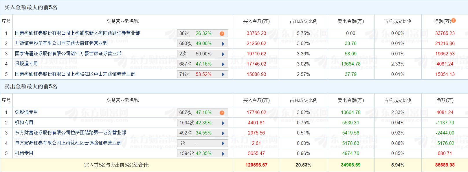 | WATER INVESTATION ATT | | | | | | | --- | --- | --- | --- | --- | --- | | 序号 | 交易营业部名称 | | | 买入金额(万) | 占息成交比例 | | 1 | 国泰海通证券股份有限公司上海浦东新区海阳西路证券营业部 | 38次 26.32% | 2 | 33765.23 | 5.75% | | 2 | 开源证券股份有限公司西安西大街证券营业部 | 693次 49.06% | A | 21250.62 | 3.62% | | 3 | 国泰海通证券股份有限公司湛江万豪世家证券营业部 | 2次 50.00% | ▲ | 19710.62 | 3.36% | | 4 | 深股通专用 | 687次 47.16% | A | 17746.02 | 3.02% | | 5 | 国泰海通证券股份有限公司上海松江区中山东路证券营业部 | 71次 53.52% | ▲ | 15088.93 | 2.57% | | | 卖出金额最大的前5名 | | | | | | 序号 | 交易营业部名称 | | | 买入金额(万) | 占息成交比例 | | 1 | ...