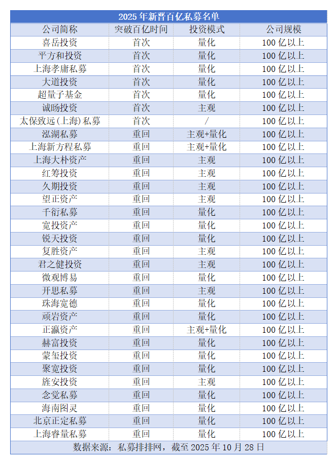 11月29日,记者从私募排排网获悉,截至今年10月28日,百亿私募数量突破至108家。与2025年9月 底的96家相比,数量增加了12家;与2024年底的91家相比,数量增加17家。 | | 2025年新晋百亿乱募名单 | | | | --- | --- | --- | --- | | 公司简称 | 突破自亿时间 | 投资模式 | 公司规模 | | 喜岳投资 | 首次 | 量化 | 100 亿以上 | | 平方和投资 | 首次 | 量化 | 100 亿以上 | | 上海孝庸私募 | 首次 | 量化 | 100 亿以上 | | 大道投资 | 首次 | 量化 | 100 亿以上 | | 超量子基金 | 首次 | 量化 | 100 亿以上 | | 诚肠投资 | 首次 | 主观 | 100 亿以上 | | 太保致远(上海)私募 | 首次 | 1 | 100 亿以上 | | 泓湖私募 | 車回 | 主观+童化 | 100 亿以上 | | 上海新方程私募 | 車買 | 主观+量化 | 100 亿以上 | | 上海大朴资产 | 車回 | 主观 | 100 亿以上 | | 红寿投资 | 車買 | 主观 | 100 亿以上 | ...