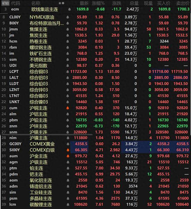 截至日间收盘,内盘基本金属普涨,仅沪铅和沪锌一同下跌,沪铅跌0.83%,沪锌跌0.73%。沪锡、沪 镍一同涨逾1%,沪锡涨1.73%,沪镍涨1.04%,其余内盘基本金属涨幅均在1%以内。氧化铝主连涨 0.95%,铸造铝主连涨0.62%。 来源:上海有色网 金属市场: 此外,碳酸锂主连大涨7.61%,工业硅主连涨1.56%,多晶硅主连涨4.36%,多晶硅主连盘中最高冲至 61985元/吨,刷新其上市以来的历史新高。欧线集运主连跌0.68%报1699.8。 | 初始 代码 | | 名城 | ●米 | 最新 | 涨幅% | 派式失 | 总量 | 到面 | 製入价 | 英出价 | | --- | --- | --- | --- | --- | --- | --- | --- | --- | --- | --- | | 3 | | 欧线集运主连 | 4 | 1699.8 | -0.68 | -11.7 | 2.42 万 | 2 | 1699.8 | 1700.3 | | | ecm | | | | | | | | | | | 8 | CLOOY | NYMEX原油 | 中 | 55.89 | 1.38 | 0.76 | ...