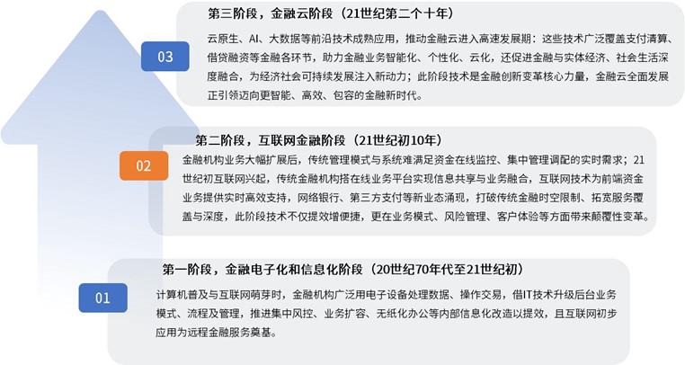 金融云是指利用云原生、人工智能、大数据等技术,将金融机构的数据、客户、流程及系统等上传到云端, 通过构建云网络来提高金融机构迅速发现并解决问题的能力,提升整体工作效率,改善流程,降低运营成 本,并为客户提供更便捷的金融服务和金融信息服务。金融云行业的发展旨在为银行、基金、保险等金融机 构提供IT资源和互联网运维服务,近年来得到了快速发展,成为推动金融行业数字化转型的关键力量。 (来源:普华有策) 金融云领域核心洞察:现状、竞争格局及数字化转型下的发展方向 1、金融云领域的发展概况 自20世纪60年代以来,科技行业技术就进行不断的迭代创新,带动金融领域业务发生相应变化。在科技发展 的驱动下,技术与金融融合主要经历以下三阶段: 金融云领域的发展阶段 资料来源:普华有策 2、金融云领域的发展现状 随着全球数字经济的蓬勃发展,金融云作为底层基础技术之一,已成为推动金融行业数字化转型的核心动 力。金融云不仅整合了强大的算力和网络资源,还为人工智能、大数据等新兴技术的应用奠定了坚实的基 础,助力金融行业提升运营效率与创新能力。在这一背景下,金融云技术作为推动力,发挥着至关重要的作 用,并引领行业向创新发展的方向迈进。 从 ...
