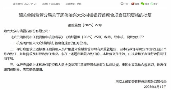 2024年12月25日,国家金融监督管理总局发布《办法》,自2025年3月1日起施行。《办法》规定,金融 机构应当在机构总部设立首席合规官。 新规实施后,城商行、股份行、金租公司、银行理财子等金融机构纷纷官宣设立首席合规官,据记者梳 理,共有23位首席合规官任职资格新获批。有业内人士指出,当前村镇银行体系仍在改革化险中,合规经 营非常重要,对于中小金融机构而言,可以考虑由高管兼任首席合规官。 4月21日,监管批复显示,周伟始兴大众村镇银行首席合规官任职资格已获批,周伟系《金融机构合规管 理办法》(以下简称《办法》)发布后,村镇银行体系内首位首席合规官。 村镇银行首位首席合规官 根据韶关金融监管分局发布的通知,监管已核准周伟始兴大众村镇银行首席合规官的任职资格。 始兴大众村镇银行应要求上述核准任职资格人员严格遵守金融监管总局有关监管规定,自该行政许可决定 作出之日起3个月内到任,并按要求及时报告到任情况。未在上述规定期限内到任的,批复文件失效,由 决定机关办理行政许可注销手续。 批复提到,该行应督促上述核准任职资格人员持续学习和掌握经济金融有关法律法规,牢固树立风险合规 意识,熟悉任职岗位职责,忠实勤勉履职。 ...