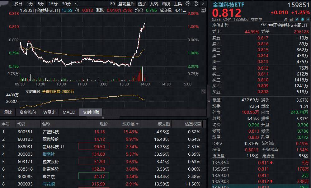 多角度把握金融科技机会,建议重点关注金融科技ETF(159851)及其联接基金(A类013477、C类 013478),按照申万一级行业,标的指数重仓计算机+非银金融,全面覆盖了互联网券商、金融IT、跨 境支付、AI应用、华为鸿蒙等热门主题。 17号午后,金融科技突然水下拉升,互联网券商、数字人民币全线活跃!截至发稿,翠微股份涨停斩获 两连板,古鳌科技逼近20CM涨停,指南针涨超5%,同花顺、东方财富、银之杰等多股跟涨超2%。热 门ETF方面,同类规模最大的金融科技ETF(159851)水下直线拉升,现场内价格涨超1%,实时成交 额超3亿元。 | | | 分制 多日 1分 5分 15分 30分 * | | | | F9 盘前盘后 盛加 九转 画线 工具 3 (2 > | | 金融科技ETF | | 159851 | | --- | --- | --- | --- | --- | --- | --- | --- | --- | --- | --- | | 0.818 | | | | 159851[金融科技ETF] 13:59 价 0.812 潘歌 0.010(1.25%) 均价 0.796 成交盘 4.41. ...
