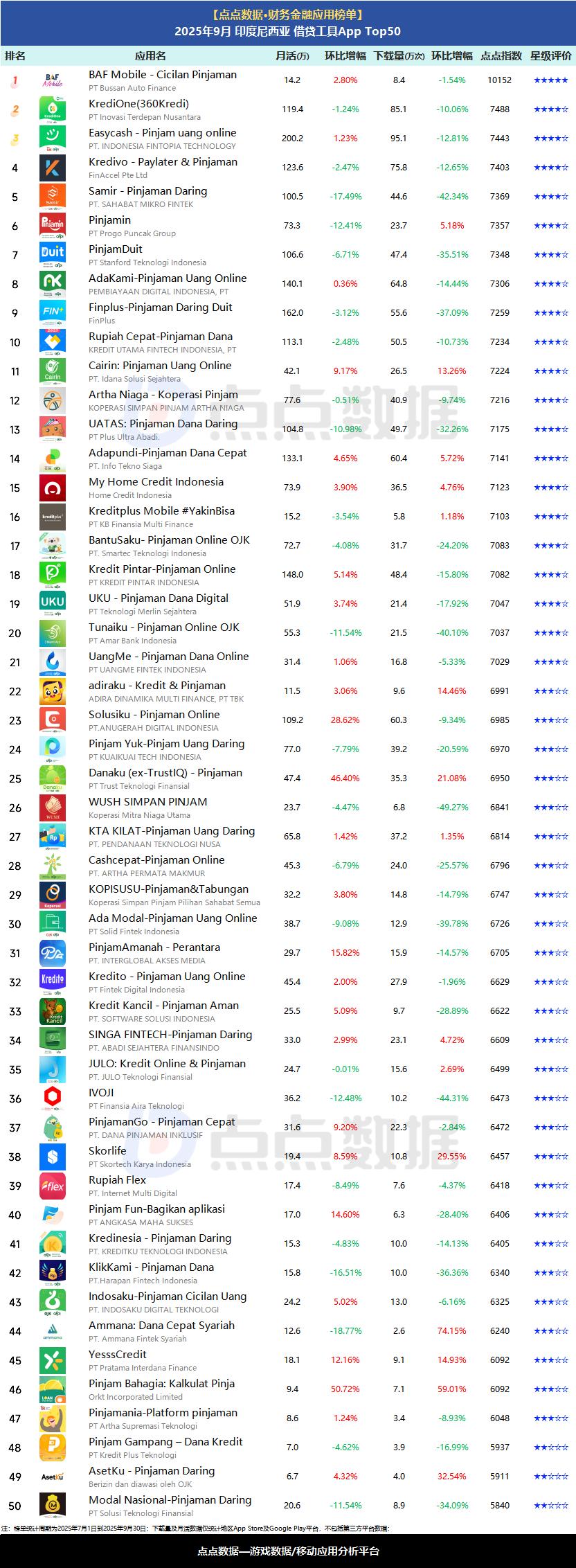 9月印尼借贷工具App Top50榜:头部五强占45%用户,《Danaku》逆势增长46.4%