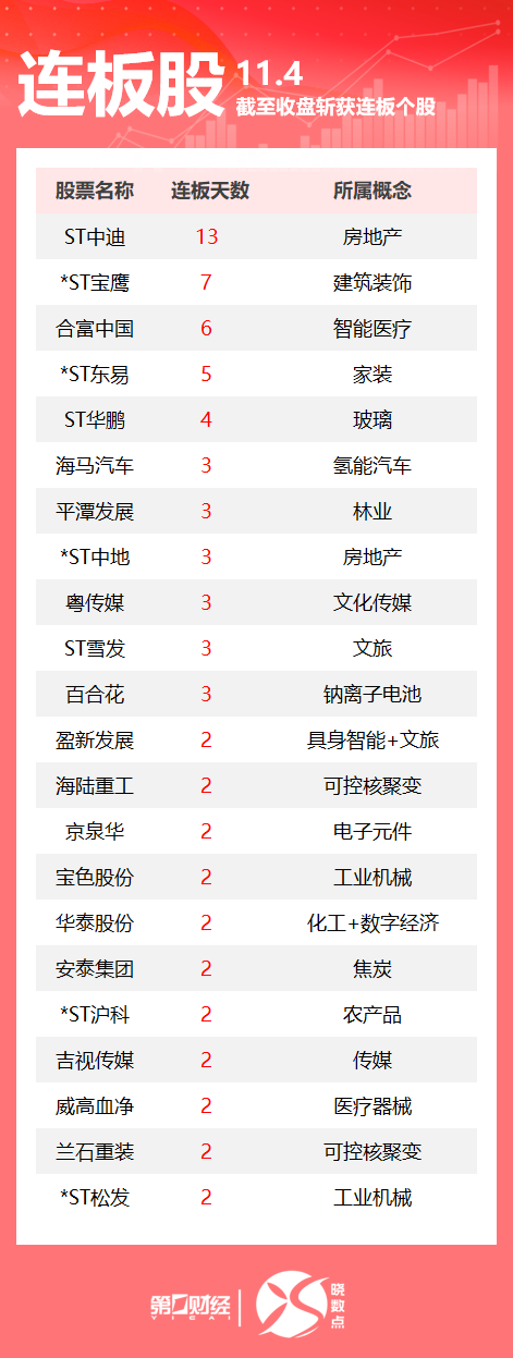 | | 连板服头 11.4 一板用头 翻壁收费新频连板个股 | | | --- | --- | --- | | 股票名称 | 连板天数 | 所属概念 | | ST中迪 | 13 | 房地产 | | *ST宝鹰 | 7 | 建筑装饰 | | 合富中国 | 6 | 智能医疗 | | *ST东易 | 5 | 家装 | | ST华服 | 4 | 玻璃 | | 海马汽车 | 3 | 氢能汽车 | | 平潭发展 | 3 | 林业 | | *ST中地 | 3 | 房地产 | | 寧传媒 | 3 | 文化传媒 | | ST雪发 | 3 | 文旅 | | 百合花 | 3 | 钠离子电池 | | 盈新发展 | 2 | 具身智能+文旅 | | 海陆重工 | 2 | 可控核聚变 | | 京泉华 | 2 | 电子元件 | | 宝色股份 | 2 | 工业机械 | | 华泰股份 | 2 | 化工+数字经济 | | 安泰集团 | 2 | 焦炭 | | *CLAPA | 2 | 衣产品 | | 吉视传媒 | 2 | 传媒 | | --- | --- | --- | | 威高血净 | 2 | 医疗器械 | | 兰石重装 | 2 | 可控核聚变 ...
