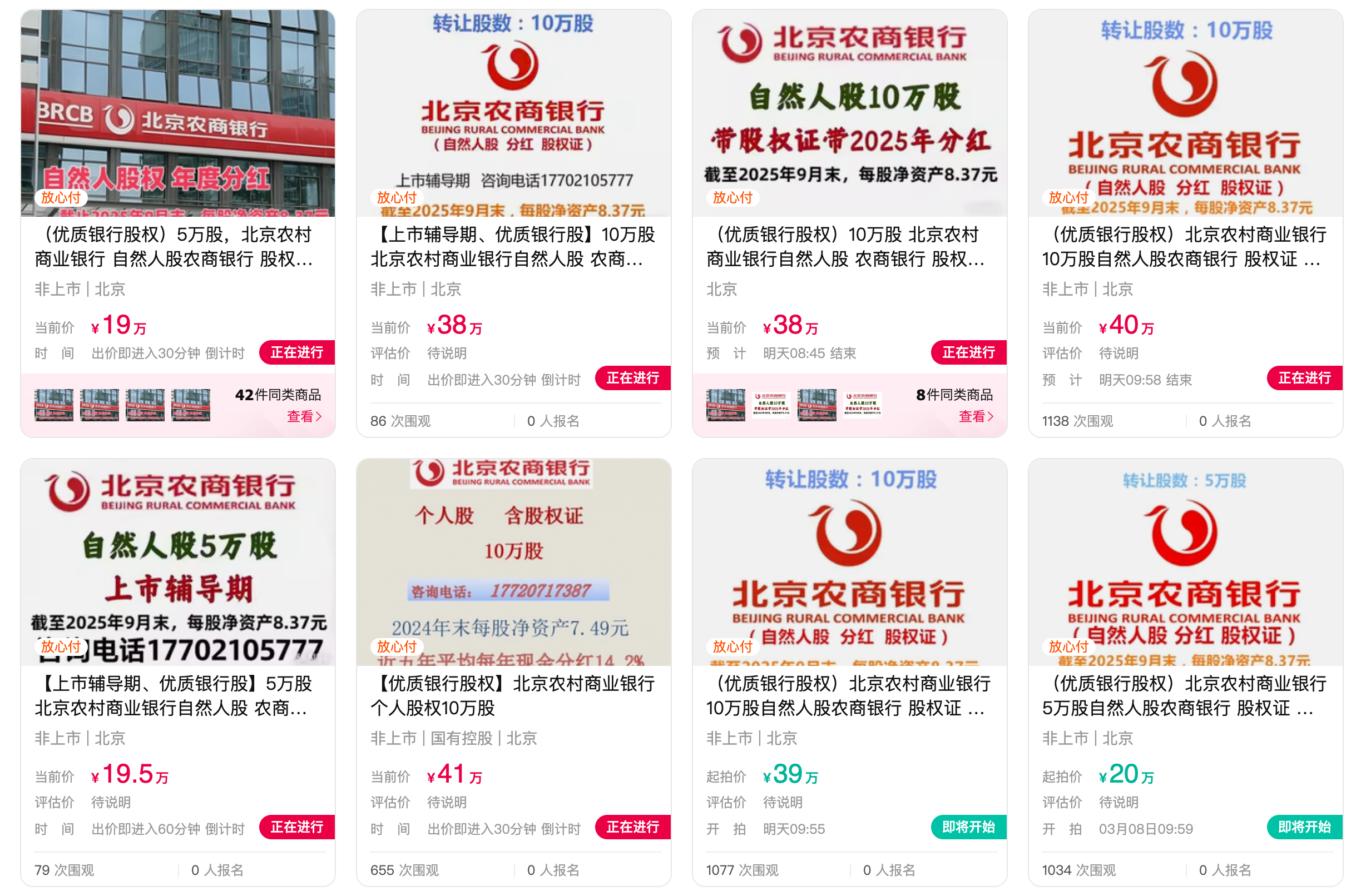 “半价”起拍,北京农商行多笔股权现身阿里拍卖