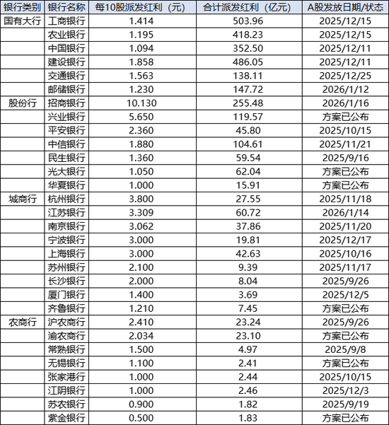 文章核心观点 - 为响应“国九条”相关要求,A股上市银行正密集实施中期分红,呈现分红节奏提前、分红率提升的特点,且参与银行范围从国有大行扩大至股份行及地方银行 [1][2] 国有大行中期分红情况 - 截至12月26日,已有21家A股上市银行实施中期分红,合计分红总额近2300亿元 [2] - 工商银行、农业银行、中国银行、建设银行、交通银行五家国有大行均于12月完成半年度分红派息,合计派发现金红利1898.85亿元,是绝对主力 [3] - 工商银行中期分红规模最大,每股派0.1414元,共计约503.96亿元 [3] - 农业银行紧随其后,每股派0.1195元,共计约418.23亿元 [3] - 建设银行每股派0.1858元,共计约486.05亿元;中国银行每股派0.1094元,共计352.50亿元 [3] - 交通银行每股派0.1563元,共计138.11亿元 [3] - 邮储银行已公布方案但尚未实施,拟每10股派1.230元,合计约148亿元,分红比例占半年度净利润的30% [4] - 四大行A股派息时间均提前至2025年12月中旬,H股派息在2026年1月下旬 [4] 股份制银行中期分红情况 - 中信银行、民生银行、平安银行三家已于2025年8月完成半年度派息,现金分红总额分别为104.61亿元、59.54亿元、45.80亿元 [5] - 兴业银行、光大银行等多家股份行在2025年下半年发布中期分红预案,分红比例多在25%以上 [5] - 兴业银行拟每10股派5.65元,分红比例为27.72% [5] - 光大银行拟每10股派1.05元,分红比例为25.20% [5] - 招商银行计划在2026年1月至2月实施中期分红,分红比例高达35% [6] 地方银行中期分红情况 - 截至12月26日,已有13家A股上市城商行、农商行落地2025年中期分红,合计分红超过185亿元 [6] - 参与银行包括上海银行、南京银行等7家城商行,以及沪农商行、常熟银行等6家农商行 [6] - 齐鲁银行和紫金银行近日加入中期分红队伍 [2][6] - 齐鲁银行拟每10股派1.21元,总额7.45亿元,分红比例28.48% [6] - 紫金银行拟每10股派0.5元,总额1.83亿元,分红比例20% [6] - 根据研报统计,苏州、民生、上海、杭州、华夏、中信6家银行2025年中期分红率较2024年中期提高了0.9至4.5个百分点 [6] 行业趋势与影响 - 上市银行中期分红呈现分红节奏提前、分红率提升的特点 [2] - 越来越多中小银行陆续加入中期分红行列 [2] - 保险等重视股息的资金或加大对银行股的财务投资力度,可能推动板块估值修复 [4]