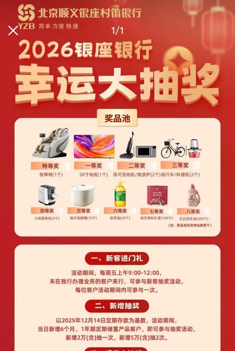 行业核心动态 - 多家中小银行在年初密集上调定期存款利率并开展“花式”营销活动以吸引储户,但利率上调幅度普遍在10至20个基点,较往年更为克制 [1][2][9] - 行业观点认为,此次利率上调是部分中小银行为应对年初“开门红”考核压力而采取的阶段性、精准化揽储策略,并非长期趋势,不影响存款利率总体下行的趋势 [1][9] 银行存款利率调整详情 - 山西左云农商行将三年期、五年期定期存款利率分别从1.45%、1.50%上浮至1.65% [2] - 宝应农商银行将三年期50万元及以上定期存款利率由1.7%上浮到1.8%,利率上浮10个基点 [2] - 吉林银行将三年期定期存款年化利率从1.75%阶段性上调至2% [3] - 盛京银行于近日上调了部分存款产品利率 [3] 银行揽储营销活动 - 北京顺义银座村镇银行推出新客存款抽奖活动,客户新增存款每2万元可抽奖一次,礼品包含按摩椅、彩电等家庭实用用品 [4] - 江苏银行推出“亮他行存单,享暖心福利”活动,客户凭他行定期存款或理财产品纪录,每1万元可免费领取1枚鸡蛋 [6] - 部分银行客户经理存在“自掏腰包”以返现或赠送京东卡、水果等方式吸引储户的情况 [8] 不同类型银行策略差异 - 与中小银行的积极揽储相比,中大型银行近期较少出现存款送礼品及上调存款利率产品的情况 [9] - 部分大型银行通过调整起存门槛进行营销,例如工商银行将3年期个人大额存单的起存门槛从100万元下调,但其年利率1.55%与50元起存的三年期定存产品最高利率持平 [9] - 行业观点认为,商业银行可能正在将传统大额存款产品转变为客户关系维护工具 [10]