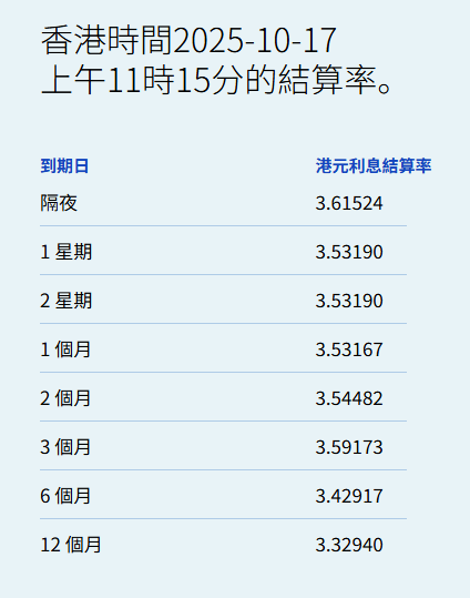 智通财经APP获悉,10月17日,港元拆息普遍向上,隔夜息报3.61524%,升19.107基点;一周拆息升 13.19基点,报3.5319%,两周则升11.869基点,报3.5319%。与楼按相关的一个月拆息报3.53167%,升 6.673基点。 | 到期日 | 港元利息結算率 | | --- | --- | | 隔夜 | 3.61524 | | 1 星期 | 3.53190 | | 2 星期 | 3.53190 | | 1 個月 | 3.53167 | | 2 個月 | 3.54482 | | 3 個月 | 3.59173 | | 6 個月 | 3.42917 | | 12 個月 | 3.32940 | 反映银行资金成本的三个月拆息报3.59173%,升6.018基点。长息方面,六个月拆息跌0.351基点,报 3.42917%,一年期则跌2.798基点,报3.3294%。 ...