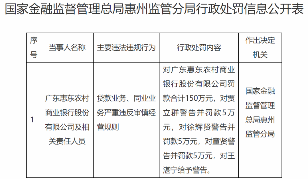 | 序 | 当事人名称 | 主要违法违规行为 | 行政处罚内容 | 作出决定 | | --- | --- | --- | --- | --- | | 를 | | | | 机关 | | 1 | 广东惠东农村 商业银行股份 | 贷款业务、同业业 | 对广东惠东农村商业 | 国家金融 | | | | | 银行股份有限公司罚 | | | | | | 款合计150万元,对贾 | | | | | | | 监督管理 | | | | 务严重违反审慎经 | 立群警告并罚款5万 | | | | | | | 总局惠州 | | | 有限公司及相 | 营规则 | 元,对徐辉贤警告并 | | | | | | | 监管分局 | | | 关责任人员 | | 罚款5万元,对童贤警 | | | | | | 告并罚款5万元,对于 | | | | | | 湛宁给予警告。 | | 罚单显示,广东惠东农村商业银行股份有限公司的主要违法违规行为是:贷款业务、同业业务严重违反审慎经营规则。 针对以上问题,国家金融监督管理总局惠州监管分局对其罚款合计150万元。 此外,广东惠东农村商业银行股份有限公司相关责任人员贾立群、徐辉贤、童贤分别被警告并处罚款5万元, ...