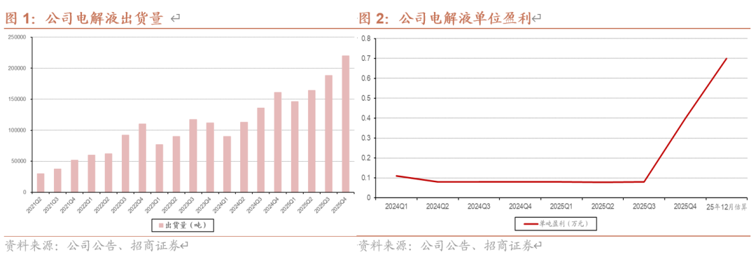 报告投资评级 - 投资评级:强烈推荐(维持)[3][6] 核心观点总结 - 公司2025年第四季度业绩预告大超预期,归母净利润中值约9.3亿元,环比增长508%,盈利拐点已现[1][6][7] - 公司作为全球最大的电解液、六氟磷酸锂、LiFSI企业,凭借全产业链一体化布局的成本优势,在原材料价格上涨周期中盈利弹性凸显[1][6][11] - 电解液价格已实现顺畅传导,预计2026年单位盈利有望进一步上行,公司业绩弹性将更突出[6][8][28] - 公司锂电材料平台架构已基本成型,除电解液外,在磷酸铁锂正极及固态电池材料领域持续投入并取得进展,综合竞争力稳固[1][6][34] 2025年Q4业绩预告点评 - **业绩大幅反转**:公司预计2025年实现归母净利润11-16亿元,同比增长127-230%;其中第四季度归母净利润中值约9.3亿元,环比增长508%[1][6][7] - **盈利超预期原因**:2025年下半年六氟磷酸锂价格迎来反转并大幅上涨,价格传导至电解液端,公司凭借电解液一体化成本优势率先实现盈利大幅反转[1][6][7] - **主营业务拆分**: - **电解液业务**:2025年第四季度出货量约22万吨,同比增长38%,环比增长17.4%;估算单吨盈利约4000元,环比增加超3000元,贡献利润接近9亿元;其中12月单月利润占比近7成,单吨盈利可能超过7000元[8] - **日化及正极业务**:日化业务预计贡献净利润近0.6亿元;磷酸铁业务第四季度出货约5万吨,预计亏损约0.4亿元,但产品已开始提价约1000元/吨,2026年有望扭亏[9] 电解液产业链一体化成本优势 - **全球龙头地位**:公司是全球最大的电解液、六氟磷酸锂、LiFSI企业,六氟磷酸锂、LiFSI自供比例达90%以上,部分核心添加剂自供比例达80%以上[1][11] - **独特工艺成本优势**:公司拥有全球最大液体六氟磷酸锂产能(折固超11万吨),其独特的液体工艺在产品质量、生产效率和综合成本上具有显著优势[11] - **LiFSI领先布局**:公司是全球最大LiFSI厂商,现有产能3万吨,市场占有率超过50%;凭借液相工艺实现生产成本快速下降,随着其与六氟磷酸锂价格出现倒挂,未来在电解液配方中的添加比例有望提升[19] - **优质客户与长单锁定**:客户包括宁德时代、LG化学、特斯拉等头部企业;近期已与瑞浦兰钧、国轩高科、楚能新能源、中创新航等签订长期保供协议,累计锁定超百万吨电解液供应量[12][25] 电解液价格传导与盈利前景 - **价格顺利传导**:电解液市场价格已完成两轮跳涨,两个月合计涨幅接近1万元/吨,与公司单位盈利提升基本匹配;6F-电解液-电池厂的价格传导路径已相对顺畅[6][28] - **具体传导过程**: - 第一轮(11月初):电解液价格较底部跳涨约3300元/吨,对应六氟磷酸锂价格从5万元/吨涨至7.5万元/吨[28] - 第二轮(11月底-12月17日):电解液价格再度跳涨约6500元/吨,对应六氟磷酸锂价格从7.5万元/吨涨至12.5万元/吨[28] - **盈利弹性可期**:电解液已开始第三轮涨价,预计公司2026年第一季度单吨盈利还会进一步修复,2026年公司单位盈利有望进一步上行[6][8] 锂电材料平台构建与新业务进展 - **磷酸铁锂正极材料**:公司已布局超过10年,现有年产30万吨磷酸铁项目(实际产量调整至20-25万吨),产品合格率问题已解决,并具备量产高端产品能力,目前已实现盈亏平衡[1][34] - **固态电池材料布局**: - **硫化物固态电解质**:公司拥有8项相关专利,采用液相法制备,已实现公斤级产品送样;其产品在-40°C露点条件下暴露24小时后仍能维持70%-80%以上的电导率,空气稳定性优异[6][35][36] - **产品性能**:公司推出的超细颗粒型(离子电导率≥6 mS/cm)与小颗粒型(≥8 mS/cm)电解质产品性能已满足高端要求[37] - **上游材料布局**:公司前瞻性布局高纯度硫化锂材料生产,纯度>99.9%,目标是降低硫化物固态电解质的BOM成本至小于30万元/吨[45][46] 财务数据与盈利预测 - **历史财务表现**:2024年公司营业总收入125.18亿元,同比下降19%;归母净利润4.84亿元,同比下降74%[2] - **业绩预测**:预计2025-2027年营业总收入分别为167.59亿元、319.53亿元、366.86亿元,同比增长34%、91%、15%[2][47] - **盈利预测**:预计2025-2027年归母净利润分别为13.52亿元、78.60亿元、85.71亿元,同比增长179%、482%、9%[2] - **业务分部预测**: - **锂电池材料**:预计2025-2027年收入分别为119.47亿元、266.59亿元、308.63亿元;毛利率分别为26.1%、47.0%、44.5%[48] - **电解液出货与均价**:预计2025-2027年出货量分别约72万吨、110万吨、130万吨;销售含税均价分别约1.7万元/吨、2.5万元/吨、2.3万元/吨[47] - **正极材料出货与均价**:预计2025-2027年出货量分别约14万吨、25万吨、35万吨;销售含税均价分别约0.9万元/吨、1.1万元/吨、1.1万元/吨[47] - **估值指标**:基于预测,公司2025-2027年每股收益分别为0.66元、3.86元、4.21元;对应市盈率分别为69.7倍、12.0倍、11.0倍[2][56]