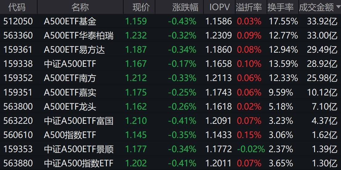 市场早盘震荡调整,深成指、创业板指翻红后再度回落,中证A500指数下跌0.36%。 每日经济新闻 有券商表示,当前A股市场处于震荡蓄势、布局来年的重要阶段,上证指数围绕4000点蓄势整固的可能性较大,市场风格再平衡仍将延续。10月金融数据显 示居民资产配置向金融资产转移的长期趋势未变,为市场提供增量资金。预计短期市场以稳步震荡上行为主,密切关注宏观经济数据、海外流动性变化以及 政策动向。 | 代码 | 名称 | 现价 | 涨跌幅 | IOPV 溢折率 换手率 成交金额 | | | --- | --- | --- | --- | --- | --- | | 512050 A500ETF基金 | | 1.159 | -0.43% | 1.1586 0.03% 17.55% | 33.92亿 | | 563360 | A500ETF华泰柏瑞 | 1.232 | -0.32% | 1.2309 0.09% 12.77% | 33.00亿 | | 159361 | A500ETF易方达 | 1.187 | -0.34% | 1.1860 0.08% 12.94% | 29.49亿 | | 159338 | 中证A500 ...
