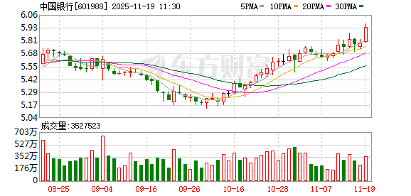 今日早盘,A股主要股指冲高回落,盘面呈现一定的"马太效应",银行等权重板块集体冲高,而以中证1000、国证2000为代表的中小盘 股表现不佳。 截至午间休市,上证指数报3938.29点,跌0.04%;深证成指跌0.32%,创业板指涨0.12%。全市场约800股上涨,超4300股下跌。 A股主要股指早盘表现 银行股早盘上涨,"工农中建"四大行股价均飘红,中国银行(601988)涨近3%再创历史新高。机构分析认为,今年四大行中期分红进度 早于去年,股权登记日在12月中上旬,因此银行中期分红抢筹行情有所提前。 碳酸锂价格持续引发关注,广期所碳酸锂期货主力合约早盘一度站上10万元/吨关口,为2024年6月以来首次。广期所昨晚调整了碳酸锂 期货手续费标准,将LC2601合约的交易手续费和日内平今仓交易手续费均调整为万分之一点二。 银行板块上涨中国银行创历史新高 早盘,银行股集体上涨,成为带动股指企稳的关键因素。截至午盘,申万银行指数上涨0.82%,中国银行上涨2.77%并再创历史新高,建 设银行、光大银行、中信银行、交通银行等涨超1%。 (17324) [11 今开 5.79 最高 5.97 最低 5.78 5.94 ...