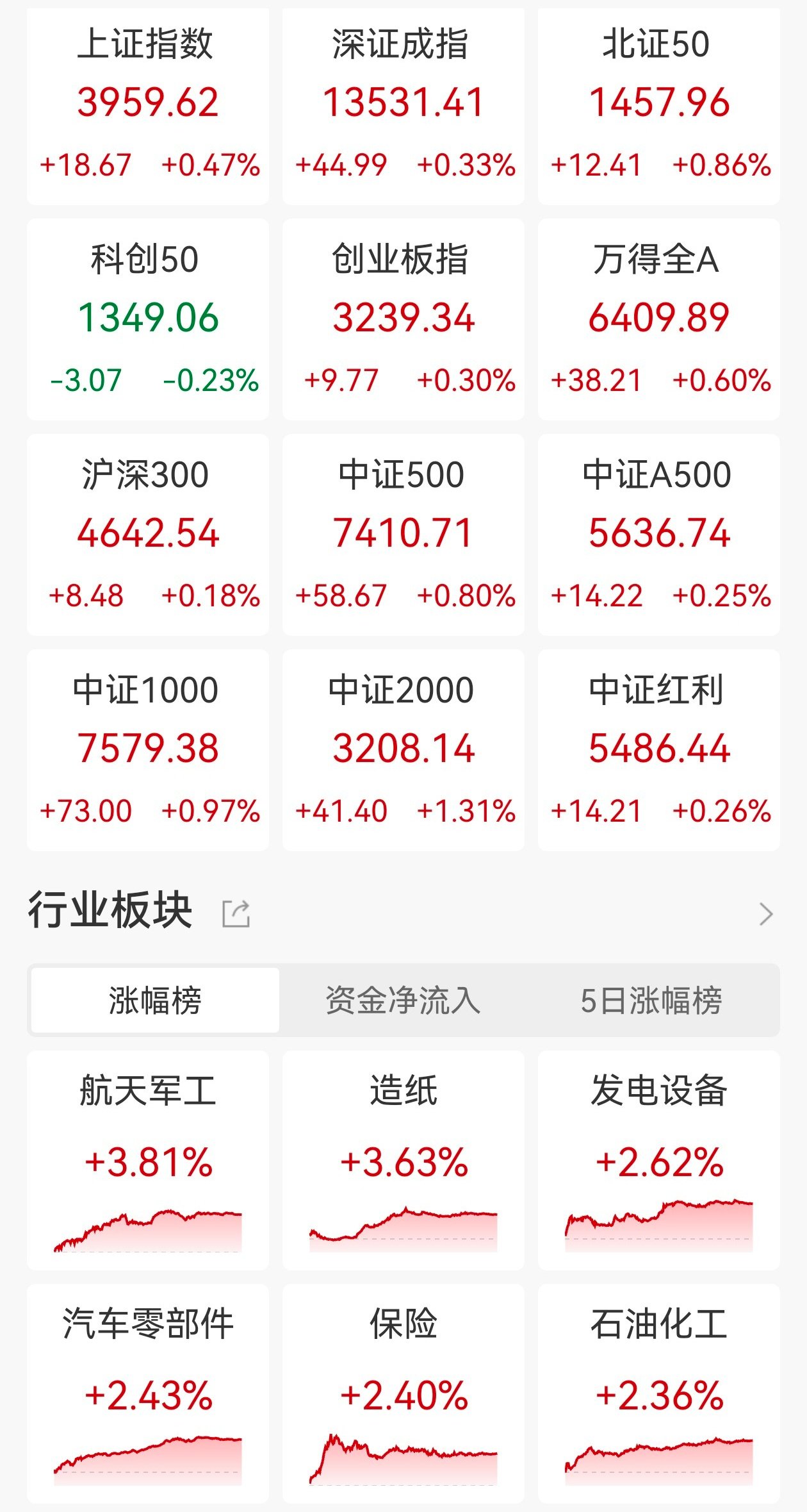 | 涨幅榜 | 资金净流入 | 5日涨幅* | | --- | --- | --- | | 航天军工 | 造纸 | 发电设1 | | +3.81% | +3.63% | +2.629 | | 汽车零部件 | 保障 | 石油化. | | +2.43% | +2.40% | +2.369 | A股三大指数今日集体上涨,沪指录得7连涨,深证成指、创业板指录得5连涨;截至收盘,沪指涨0.47%报3959点,深证成指涨0.33%,创业板指涨0.3%。全 市场成交额1.94万亿元,较前一交易日增量467亿元,近3800股上涨。 盘面上,商业航天板块持续爆发,中国卫星、航天电子及超捷股份等二十余股涨停;卫星互联网板块走高,三维通信、通宇通讯等多股涨停;造纸板块拉 升,五洲特纸等多股涨停;人形机器人板块活跃,华菱线缆等多股涨停;空间站概念、军工、汽车零部件及电机等板块涨幅居前。另外,贵金属板块持续回 落,湖南白银领跌;海南板块走低,海南瑞泽跌近7%;免税概念走弱,凯撒旅业跌超6%;锂矿概念、CPO概念及乳业股等跌幅居前。(格隆汇) | 上证指数 | 深证成指 | 北证5( | | --- | --- | --- | | 39 ...
