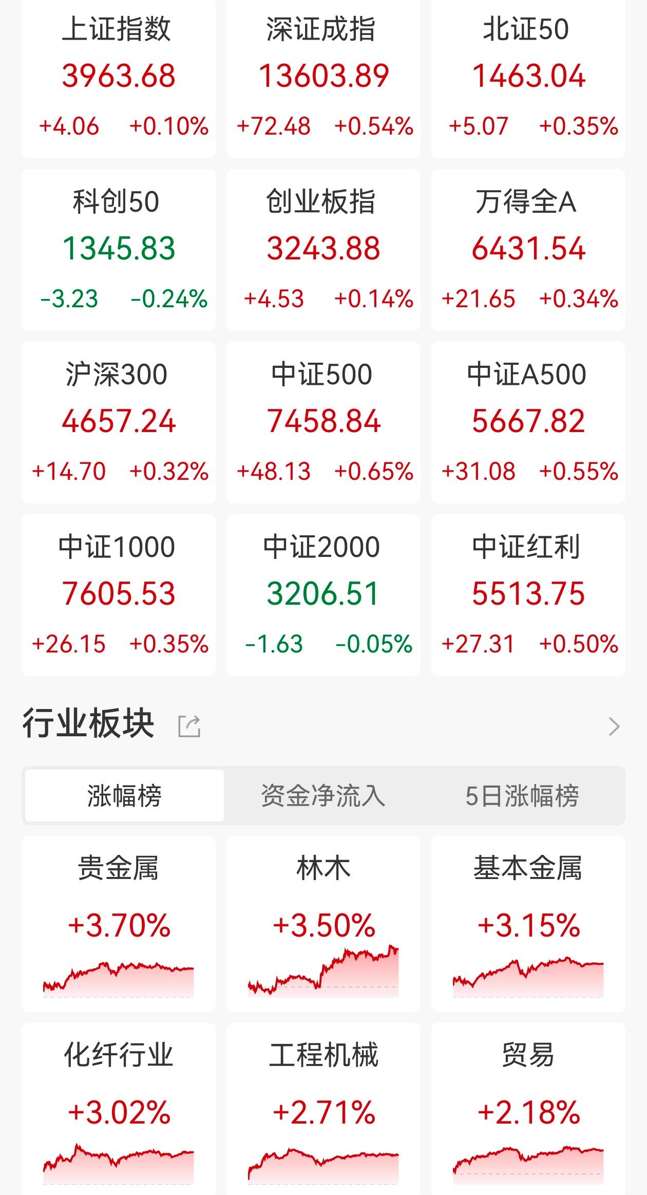 | 上证指数 | 深证成指 | 北证5C | | --- | --- | --- | | 3963.68 | 13603.89 | 1463.0 | | +4.06 +0.10% +72.48 +0.54% +5.07 +0 | | | | 科创20 | 创业板指 | 万得全/ | | 1345.83 | 3243.88 | 6431.5 | | -3.23 -0.24% +4.53 +0.14% +21.65 +0 | | | | 沪深300 | 中证500 | 中证A5( | | 4657.24 | 7458.84 | 5667.8 | | +14.70 +0.32% +48.13 +0.65% +31.08 +0 | | | | 中证1000 | 中证2000 | 中证红和 | | 7605.53 | 3206.51 | 5513.7 | | +26.15 +0.35% | -1.63 -0.05% +27.31 +0 | | 涨幅榜 资金净流入 5日涨幅* 林木 贵金属 基本金) +3.70% +3.159 +3.50% 化纤行业 工程机械 贸易 +2.71% +3.02% +2.189 A股三大指数 ...