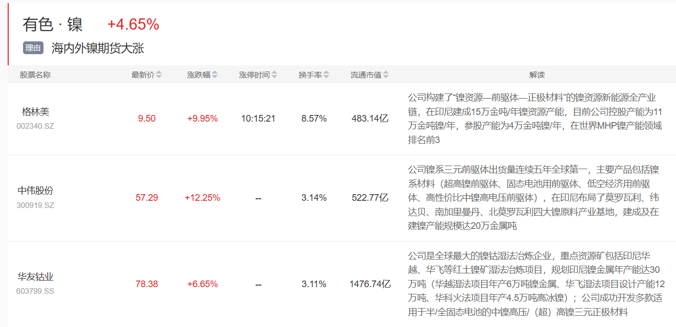 市场表现 - 2026年1月7日,有色镍板块集体大涨,板块指数上涨4.65% [1][2] - 格林美涨停,最新价9.50元,涨幅+9.95%,流通市值483.14亿元 [2] - 中伟股份涨幅超过10%,最新价57.29元,涨幅+12.25%,流通市值522.77亿元 [2] - 华友钴业上涨6.65%,最新价78.38元,流通市值1476.74亿元 [2] - 中国一重、芳源股份、伟明环保、兴业银锡、天奇股份、盛屯矿业等公司股价亦集体大涨 [1] 价格上涨驱动事件 - 2026年1月7日,上海期货交易所基本金属期货夜盘全线上涨,其中沪镍涨幅一度达到8% [3] - 伦敦金属交易所期镍价格上涨近9%,盘中涨幅一度突破10%,触及18785美元/吨,为2024年6月5日以来最高位 [3] - 印尼淡水河谷公司因2026年度工作计划未获官方批准,暂停镍矿开采业务,市场供给收缩预期强化 [3] 机构对价格上涨的解读 - 本轮镍价上涨主要由印尼削减镍矿配额的叙事和宏观情绪共同推动 [4] - 全球宏观流动性预期转向宽松,美元走弱,资金回流大宗商品市场,助推镍价 [4] - 美国对委内瑞拉展开军事行动使得市场对有色金属的地缘溢价讨论升温,带动镍价 [4] - 核心逻辑在于供给端收缩预期与需求端稳定支撑的共振 [4] - 印尼作为全球镍资源核心供给国,其配额调整直接影响行业供需格局,淡水河谷印尼停产事件进一步放大了供给收缩预期 [4] 行业供需格局分析 - 国际镍研究组织预计2026年全球镍市场需求量达382万吨,产量达409万吨 [4] - 机构测算印尼镍产量预计减少20万至30万吨,可能导致2026年镍供需反转 [4] - 印尼镍冶炼行业2026年镍矿需求量预计达3.4亿至3.5亿吨,而政府设定的产量目标2.9亿吨与之形成缺口,有望加速镍行业供需再平衡 [4] - 中长期看,全球有色金属行业供需格局持续优化,镍作为能源金属受益于新能源汽车、储能等下游领域需求增长 [5] - 供给端除印尼配额限制外,全球镍矿端供给约束仍存,智利等主要产镍国产量波动进一步加剧供给紧张 [5] - 随着美联储2026年降息预期升温,货币宽松环境将为有色金属价格提供支撑,镍价有望继续向上突破 [5] 产业链相关公司业务与产能 - 格林美构建了“煤资源-前驱体-正极材料”产业链,在印尼建成15万金吨/年镍资源产能,参股产能为4万金吨镍/年,其镍系三元前驱体出货量连续五年排名前3 [2] - 中伟股份产品覆盖超高镍前驱体、固态电池用前驱体、高性价比中镍高电压前驱体,在印尼达贝、南加里曼丹、北莫罗瓦利四大基地的产能规模达20万金属吨 [2] - 华友钴业是全球最大的镍钴湿法冶炼企业,拥有华越、华飞等红土镍矿湿法冶炼项目,其中华越湿法项目年产6万吨镍金属,华科火法项目年产4.5万吨高冰镍,产品可用于半/全固态电池的中镍高压/(超)高镍材料 [2] 产业链影响与展望 - 镍价上涨将直接传导至镍钴湿法冶炼、三元前驱体等环节,相关企业盈利弹性有望释放 [4] - 预计2026年相关标的业绩将随产品价格上涨实现显著增长 [4] - 产业链上下游均将受益于行业景气度提升:上游聚焦镍矿开采企业,中游关注湿法冶炼、火法冶炼企业,下游覆盖三元前驱体、动力电池材料等应用领域 [5]