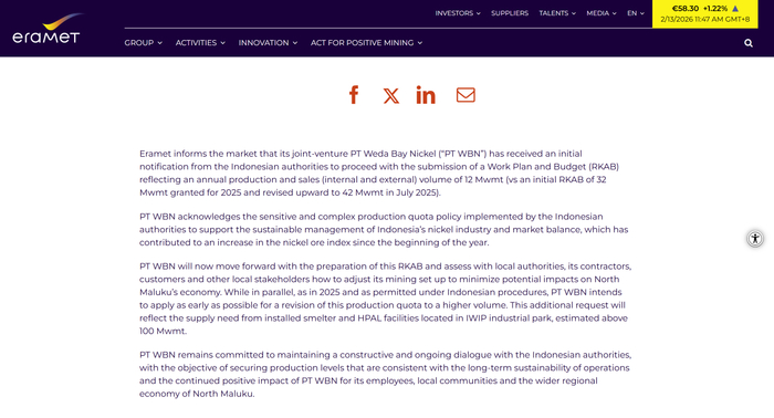 文章核心观点 - 印尼政府收紧镍矿供应政策 全球最大镍矿韦达湾年度开采配额遭大幅削减超71% 同时印尼2026年全国镍矿生产配额总量预计较2025年下滑约三成 政策意图在于抬高资源价值并吸引投资[1][3][4][5] - 供应收紧预期导致市场测算2026年印尼镍矿将出现3000万至4000万吨的供应缺口 市场可能从“相对宽松”转向“系统性紧缺”[5] - 面对供应侧冲击 国内相关企业已调整在印尼的投资与供应策略 但近期镍价因假期、资金行为及基本面尚未明显紧张而出现回调[6][8][9] 印尼政策与供应影响 - 印尼能矿部向全球最大镍矿PT Weda Bay Nickel发出初步通知 其可提交年度产销量为1200万吨的RKAB 较2025年获批的4200万吨开采配额降幅超71%[1][3] - 印尼政府计划将2026年批准的镍矿生产配额总量设定在2.6亿至2.7亿吨之间 较2025年的3.79亿吨下滑约三成[3][4] - 分析师指出 印尼政策导向旨在通过收紧供应抬高镍矿价格 从资源端获取更大利益 并扭转因镍价低迷导致的投资撤资趋势 今年配额限制力度高于往年[5] - 据机构测算 2026年印尼镍矿总需求约3.2亿至3.3亿吨 与目前公布配额存在6000万至8000万吨差距 考虑库存与进口补充后 仍有3000万至4000万吨缺口 市场可能转向系统性紧缺[5] - 历史经验显示 印尼年中有释放补充配额的可能性 但具体量级需持续关注[5] 相关公司动态与应对 - 法国埃赫曼集团表示 其合资的韦达湾镍矿计划像2025年一样 尽早申请上调生产配额[3] - 格林美宣布终止其印尼全资下属公司QINGMEI的增资扩股事项 主要基于内外部形势变化及审慎评估风险[6] - 格林美表示 其印尼镍资源项目主要镍矿供应商为Merdeka和Hengjaya 并已签署长单保供协议 能充分保障生产需求[6] - 华友钴业回应称 其印尼子公司镍矿料主要通过参股矿山、长期供应合作协议保障 以市场化采购补充[6] - 华友钴业与淡水河谷印尼、福特汽车合作的年产12万吨镍金属量湿法项目 预计2026年底建成投产[7] 镍价与市场反应 - 2025年全球镍价承压下行 沪镍主力合约一度跌破11.2万元/吨 创近五年新低[3] - 近期在供应短缺预期下 镍价未持续上涨 截至2月13日收盘 沪镍主力合约下跌3.66% 报收于13.52万元/吨[8][9] - 短期镍价回调受春节假期临近资金获利了结、宏观市场回落及基本面尚未感受到明显紧缺影响[9] - 由于镍矿价格已逐步上涨 镍价底部边际明显上移 长期因供需呈现小幅缺口 镍价将表现为年度重心上移的震荡行情[9]