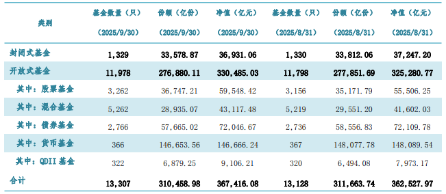 这1.85万亿元权益类基金的增量资金流向了何处?从基金份额变化来看,资金更青睐被动权益类基金, 对主动权益类基金的偏好则有所分化,呈现"一增一减"的态势。 具体来看,Choice数据显示,三季度被动权益类基金份额大增,从二季度末的3.1万亿份升至三季度末 的约3.3万亿份,成为资金流入权益类基金的最主要选择。与被动权益类产品的"一骑绝尘"不同,主动 权益类基金的资金流向较为"分裂",含权比例较高的普通股票型、偏股混合型基金(不含QDII)三季度 期间份额分别环比降逾百万份、千万份,而配置型的偏债混合型基金却小幅回暖,三季度份额增逾40万 份。 这意味着,目前风险偏好较高的投资者更愿意通过被动权益类基金分享贝塔收益,而稳健型资金则偏好 通过偏债混合等股债配置型产品入场。 如何更好地承接居民资金 在市场风险偏好提升,以及市场波动的大环境下,基金公司如何更好地承接居民资金并实现"双赢",成 为现阶段行业的重要课题。 更多匹配投资者需求的产品在扎堆成立。Choice数据显示,截至10月30日,今年以来新成立的被动权益 类基金数量已经过千(不同份额分开计算)。 中国证券投资基金业协会最新数据显示,权益类基金三季度末规模 ...