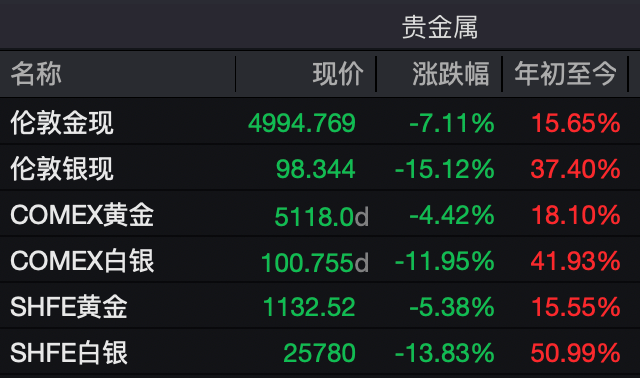 1月30日晚间,黄金、白银、美股,集体下挫。 截至发稿,国际现货黄金跌超7%,失守5000美元关口;现货白银跌超15%,失守100美元关口。国内沪 金期货主力合约开盘跌超5%,最新报1132.52元/克;沪银期货主力合约跌近14%,报25780元/千克。 | 名称 | 现价 | 涨跌幅 | | --- | --- | --- | | 道琼斯工业平均 | 48896.28 | -0.36% | | 纳斯达克指数 | 23567.69 | -0.50% | | 标普500 | 6941.98 | -0.39% | | 纳斯达克100 | 25713.05 | -0.66% | | 万得美国科技七巨头指数 | 66367.78 | -0.16% | | 万得中概科技龙头指数 | 4403.92 | -1.39% | | 纳斯达克中国会龙指数 | 7838.65 | -1.02% | 沃什2006年加入美联储,是当时最年轻的美联储理事。在美联储任职期间,沃什持鹰派货币政策立场, 但近年转向支持特朗普的关税政策及加快降息立场。 | 名称 | 涨跌幅 ▲ | | --- | --- | | [US]邮轮指数 | -5.2 ...