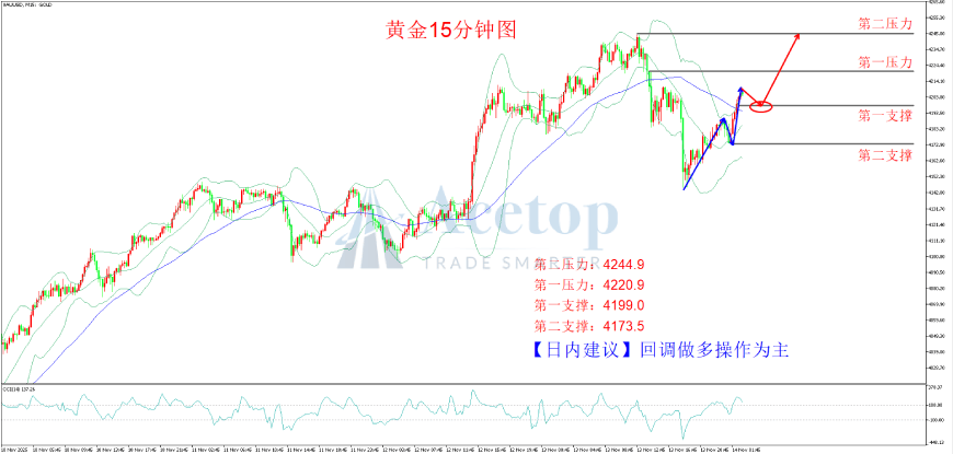 一、基本面: 美国白宫国家经济委员会主任哈塞特明确表示,预计第四季度GDP将因政府停摆而下降1.5%,这一显著的经济增长预期下 修,直接指向经济动能放缓,这无疑会削弱美元的强势基础,并提升黄金作为避险资产的吸引力。更重要的是,他直言"看 不到不降息的太多理由",这一罕见的鸽派表态与市场对货币政策转向的期待形成共振,暗示未来利率水平有望下移,而黄 金作为无息资产,其持有成本将随之下降,这对金价构成根本性支撑。 其次,经济数据的混乱与不确定性为金价提供了温床。特朗普承认政府停摆造成了1.5万亿美元的巨大损失,但其全面影响 需数周甚至数月才能厘清,同时关键的经济报告如就业数据将缺失失业率这一核心指标。这种数据层面的"真空"与失真, 使得市场和经济学家难以准确评估美国经济的真实健康状况,不仅加剧了市场波动,也迫使投资者寻求黄金这类不依赖于 单一国家经济数据的硬资产来对冲不确定性风险。 上图为白银15分钟图,图中可见,价格前期上行趋势多头动能充足,短期虽有回落,但尚未改变整体上行结构,目前再次 上行,显示多头优势强于空头,同时价格上穿均线MA20和MA60,显示行情多头或将有所延续。布林带拐头向上,或预示 行情将继续上 ...