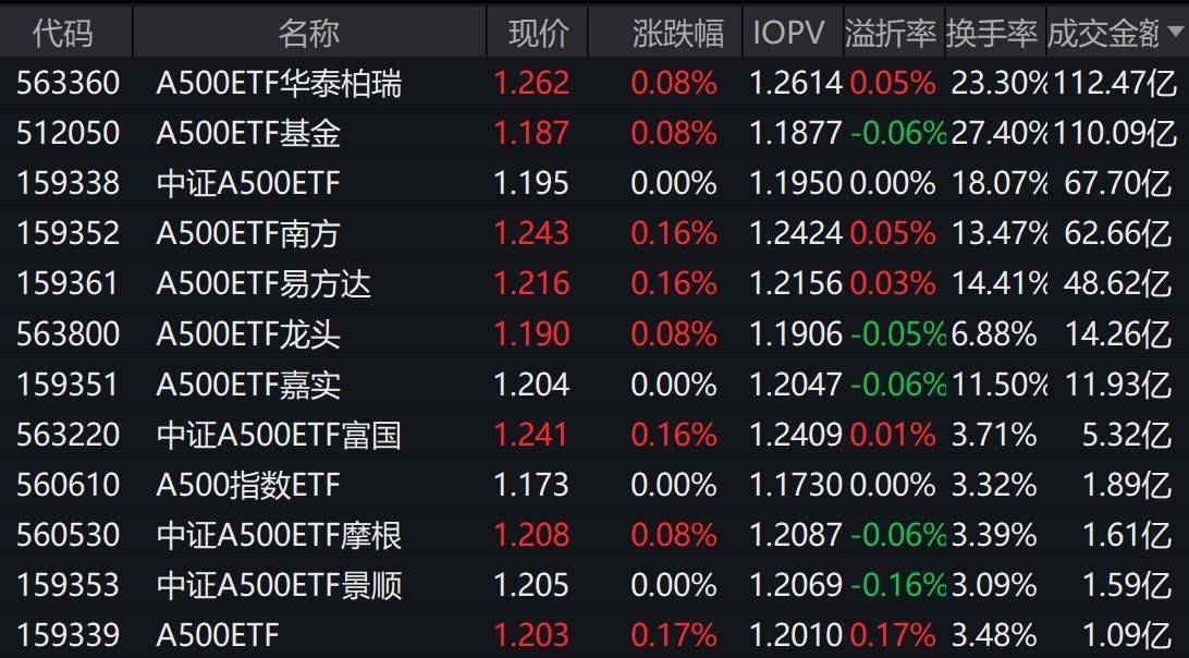 沪指早盘一度震荡翻红,中证A500指数上涨0.13%,2只中证A500相关ETF成交额超110亿元
