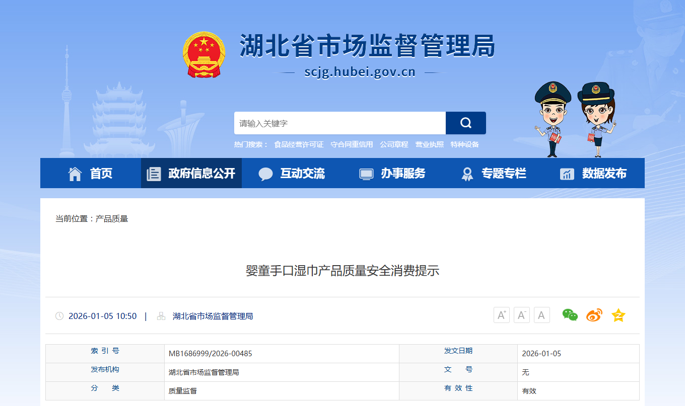 湖北省市场监管局发布婴童手口湿巾产品质量安全消费提示