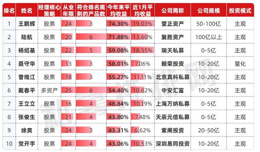最近一则新闻在投资圈引发热议:今年已有318位公募基金经理离职,创下近五年新高。这些曾经管理百亿规模的"明 星"们,为何纷纷转战私募?更令人好奇的是,他们中不少人在私募市场依然表现亮眼,平均收益高达28.26%。作为一 名深耕量化领域多年的投资者,我看到的不仅是人事变动,更是一场关于市场本质的深刻变革。 | 排名 姓名 | | | 经理核心 从业 符合排名规 | | 六年出か | 近1月平 | 公司简称 | 公司规模 | 投资模式 | | --- | --- | --- | --- | --- | --- | --- | --- | --- | --- | | | | 策略 | | 年限 则的产品数 均收益 | | 均收益 | | | | | 王鹏辉 : | | 股票 | 24 | 3 | 74.30% | 19.03% | 望正资产 | 50-100亿 | 主观 | | 2 陆航 | | 股票 | 20 | 6 | 71.88% | 13.60% | 复胜资产 | 100亿以上 | 主观 | | m 杨绍墓 | | 股票 | 22 1 | 5 | 59.08% | 18.55% : | 瑞天私募 | 0-5 ...