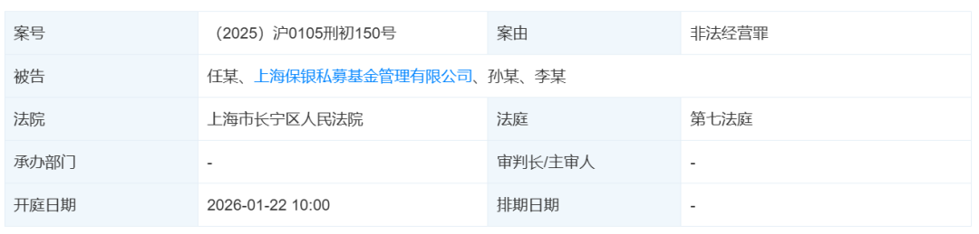 据天眼查网站,上海保银私募基金管理有限公司(简称"上海保银")及任某、孙某、李某遭起诉,案由为非法经营罪,开庭时间为2026年1月22日,审理法 庭为上海市长宁区人民法院第七法庭。 具体而言,上海保银在私募基金运营过程中存在将基金投资管理职责擅自委托他人行使的行为。上海保银时任法定代表人、执行董事、总经理李墨,时任 合规风控负责人鲍佳溶,二人双双收到证监局警示函。 另需注意的是,上海保银在2025年12月19日提交了高管变更信息,不过最新状态为终止变更。 ↓↓↓ | 案号 | (2025) 沪0105刑初150号 | 案由 | 非法经营罪 | | --- | --- | --- | --- | | 被告 | 任某、上海保银私募基金管理有限公司、孙某、李某 | | | | 法院 | 上海市长宁区人民法院 | 法庭 | 第七法庭 | | 承办部门 | | 审判长/主审人 | | | 开庭日期 | 2026-01-22 10:00 | 排期日期 | | 值得一提的是,深圳前海千惠资产管理有限公司(简称"千惠资产")及相关成员也因非法经营罪遭到起诉。据媒体报道,千惠资产2024年上半年便有员工被 带走调查,原因大概率 ...