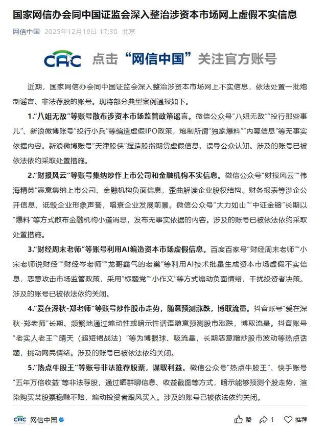 3."财经周末老师"等账号利用AI编造资本市场虚假信息。 百度百家号"财经周末老师""小宋老师说财 经""财经岑老师""龙哥霸气的老巢"等利用AI技术批量生成资本市场虚假不实信息,恶意攻击市场监 管政策,采用"标题党""小作文"等方式煽动负面情绪,干扰投资者决策。涉及的账号已被依法依约关 闭。 2025.12. 19 本文字数:1070,阅读时长大约2分钟 来源 | 网信中国 近期,国家网信办会同中国证监会深入整治涉资本市场网上不实信息,依法处置一批炮制谣言、非法 荐股的账号。现将部分典型案例通报如下。 1."八姐无敌"等账号散布涉资本市场监管政策谣言。 微信公众号"八姐无敌""投行那些事儿"、新浪 微博账号"投行小兵"等编造虚假IPO政策,炮制所谓"独家爆料""内幕信息"等无事实依据内容。新浪 微博账号"天津股侠"捏造股指期货虚假信息,误导公众认知。涉及的账号 已被依法依约采取处置措 施。 2."财报风云"等账号集纳炒作上市公司和金融机构不实信息。 微信公众号"财报风云""伟海精英"恶 意集纳上市公司、金融机构负面信息,歪曲解读企业股权结构、财务报表等涉企公开信息,诋毁企业 形象声誉,唱衰企业发展前景。微信 ...