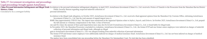 阿斯利康2025年年报披露的诉讼进展 - 公司2025年年报披露了涉及个人信息侵权、非法贸易等多项诉讼进展 [1] 非法贸易指控及海关处理 - 2025年10月,阿斯利康(中国)收到深圳海关最终评估意见,未缴纳的进口税款总额为2400万元人民币(约合350万美元) [1] - 所涉税款与度伐利尤单抗、替西木单抗和德曲妥珠单抗的进口相关 [1] - 公司已全额预缴2400万元人民币补偿款,但若被认定负有非法贸易责任,可能面临相当于已缴税款1至5倍的罚款 [1] 个人信息侵权及非法贸易公诉 - 2025年11月,深圳市人民检察院完成评估,对阿斯利康(中国)、一名前执行副总裁及一名前高级雇员提起公诉,指控涉及非法收集个人信息和非法贸易 [1] - 公诉并未指控公司因非法收集个人信息获得非法收益 [1] - 该名前执行副总裁及前高级雇员还被额外指控犯有医疗保险欺诈罪,但公司未因此罪名被公诉 [1] - 上述事项已合并至深圳市中级人民法院的一个诉讼程序中,尚未安排庭审日期 [1] 相关高管调查背景 - 2024年10月底,阿斯利康全球官网公布,时任阿斯利康全球执行副总裁、国际业务主席及中国区总裁王磊正在中国配合调查 [2] - 2024年11月,公司披露王磊及现任、前任高管被查一事与之前的靶向肺癌药泰瑞沙骗保案无关,而是涉及药品进口与数据问题,且王磊已被拘留 [2] - 从职务和涉及事件推断,2025年年报中提及的前执行副总裁即为王磊 [2]