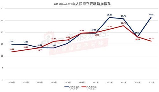 近日,央行发布了2025年金融统计数据报告,全年人民币存款增加26.41万亿元,同比多增 8.42万亿元。 其中,住户存款增加14.64万亿元,与上年相比基本持平(2024年为14.26万亿元)。从近十 年趋势看,住户存款增量普遍呈现上升趋势,虽然低于2022年的峰值,但仍维持较高规模。 与之相对,住户贷款去年仅增加4417亿元,与2021年峰值时期的年新增近8万亿元相比,增 量仅为其百分之五。 值得一提的是,2025非银行业金融机构存款增加6.41万亿元,同比多增3.82万亿元,增量更 是创下自2015年以来的新高。有专家表示,12月非银存款同比大幅多增,与当月以来权益市 场成交金额的火热相匹配。 居民"多存少贷",存款增量环比提升2.58万亿 从央行发布的2025年金融统计数据报告看,12月末,本外币存款余额336.14万亿元,同比增 长9%;月末人民币存款余额328.64万亿元,同比增长8.7%。 增量方面,全年人民币存款增加26.41万亿元,同比多增8.42万亿元。不过,与之相比,全年 人民币贷款增加16.27万亿元,增量不及存款。 注:新浪金融研究院 同花顺ifind数据显示,我国居民部门存款总额在 ...