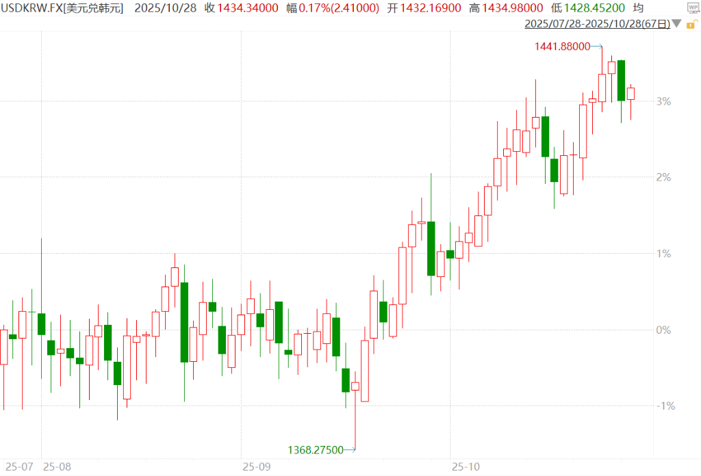 韩元汇率正逼近2009年全球金融危机以来的最低点。 今年以来,韩元持续贬值,过去三个月内下跌6%,成为亚洲跌幅最大的货币。 本周,韩元兑美元一度跌至1475,距离跌破2009年3月的1487.45关键水平仅一步之遥。 外资撤离 这一波贬值背后是巨额外资撤离。在11月的第一周,海外投资者净卖出了7.26万亿韩元(约合52亿美元) 的韩国股票,创下历史最大的单周净流出纪录。 这一数字甚至超过了整个10月份的5.34万亿韩元流出规模,几乎抹去了9月份的全部流入。 外资抛售的重点集中在芯片制造商,这些企业此前因AI概念而被高估值,如今面临市场对AI股过热的 担忧。 除短期因素外,韩国人对海外证券的强劲需求也在加剧韩元贬值压力。 花旗银行分析师金镇旭(Jin-Wook Kim)最近发布的报告更是指出,韩国承诺在美国投资的3500亿美元可 能会对韩元构成相当大的长期压力。 这一巨额投资意味着韩国公共机构每年需要筹集200亿至300亿美元的外币,其中大部分可能要通过债券 市场解决,从而增加融资成本并给韩元带来额外压力。 影响经济复苏 面对韩元持续贬值,韩国当局已开始出手应对。 韩国央行行长李昌熔近期明确表示,如果汇市波动过 ...