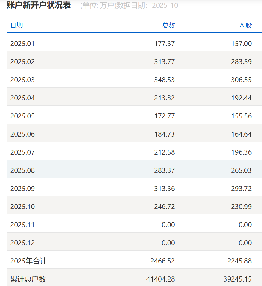 | 日期 | 总数 | A 股 | | --- | --- | --- | | 2025.01 | 177.37 | 157.00 | | 2025.02 | 313.77 | 283.59 | | 2025.03 | 348.53 | 306.55 | | 2025.04 | 213.32 | 192.44 | | 2025.05 | 172.77 | 155.56 | | 2025.06 | 184.73 | 164.64 | | 2025.07 | 212.58 | 196.36 | | 2025.08 | 283.37 | 265.03 | | 2025.09 | 313.36 | 293.72 | | 2025.10 | 246.72 | 230.99 | | 2025.11 | 0.00 | 0.00 | | 2025.12 | 0.00 | 0.00 | | 2025年合计 | 2466.52 | 2245.88 | | 累计总户数 | 41404.28 | 39245.15 | 图片来源:上交所 11月4日,上交所网站最新数据显示,10月上交所A股新开户数230.99万户,较9月新开户数293 ...