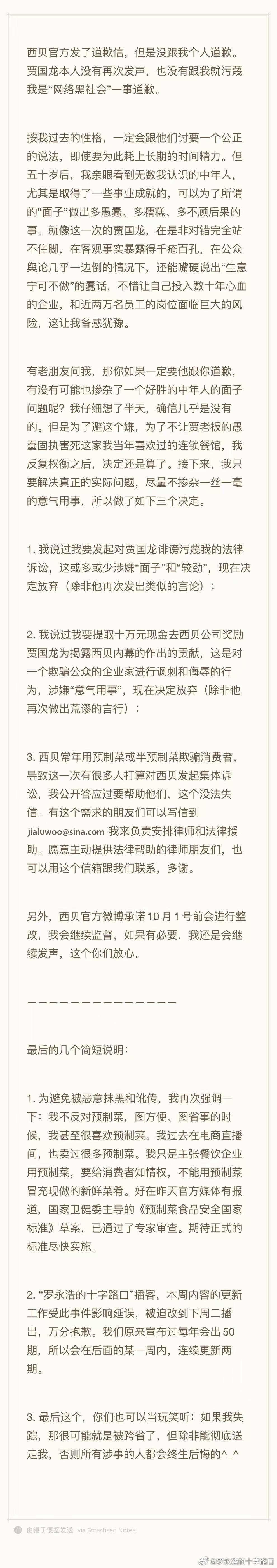 来源:上海证券报·中国证券网 上证报中国证券网讯(记者 冯心怡)9月15日晚间,罗永浩在社交媒体表示,决定放弃追究西贝。他再次强调,自己不反对预制菜,但主张 餐饮企业用预制菜时,要给消费者知情权,不能用预制菜冒充现做的新鲜菜肴。 罗永浩表示,西贝官方发了道歉信,但是没跟其个人道歉。西贝创始人贾国龙本人没有再次发声,也没有跟他就污蔑其是"网络黑社会"一事 道歉。 关于此前其说要发起对贾国龙诽谤污蔑的法律诉讼,罗永浩表示,"这或多或少涉嫌面子和较劲",现在决定放弃;此前提及要提取十万元现 金去西贝公司奖励贾国龙威揭露西贝内幕作出的贡献,涉嫌"意气用事",现在决定放弃。 罗永浩称,西贝官方微博承诺10月1日前会进行整改,其会继续监督。若消费者对西贝发起集体诉讼,罗永浩表示会负责安排律师和法律援 助。 3. 西贝常年用预制菜或半预制菜欺骗消费者, 导致这一次有很多人打算对西贝发起集体诉 讼,我公开答应过要帮助他们,这个没法失 信。有这个需求的朋友们可以写信到 jialuwoo@sina.com 我来负责安排律师和法律援 助。愿意主动提供法律帮助的律师朋友们,也 可以用这个信箱跟我们联系,多谢。 另外,西贝官方微博承诺 ...