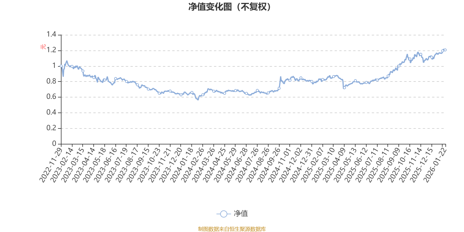 基金业绩与规模 - 2025年第四季度基金利润为1247.22万元,加权平均基金份额本期利润为0.0279元 [2] - 第四季度基金净值增长率为1.54%,截至四季度末基金规模为6.09亿元 [2] - 截至1月22日,单位净值为1.206元 [2] - 近三个月复权单位净值增长率为12.68%,在同类39只基金中排名第15 [4] - 近半年复权单位净值增长率为42.59%,在同类39只基金中排名第13 [4] - 近一年复权单位净值增长率为45.27%,在同类38只基金中排名第22 [4] - 近三年复权单位净值增长率为16.59%,在同类32只基金中排名第10 [4] 风险收益指标 - 近三年夏普比率为0.5776,在同类32只基金中排名第8 [8] - 截至1月21日,近三年最大回撤为47.34%,在同类32只基金中排名第19 [9] - 单季度最大回撤出现在2023年第一季度,为19.29% [9] 资产配置与持仓 - 近三年平均股票仓位为85.44%,同类平均为87.73% [12] - 2023年上半年末基金达到最高仓位94.17%,2024年第一季度末为最低仓位79.88% [12] - 截至2025年第四季度末,基金前十大重仓股为阳光电源、宁德时代、德业股份、大金重工、东方电缆、华友钴业、迈为股份、中天科技、同飞股份、金风科技 [17] 行业观点与投资策略 - 基金管理人继续看好储能行业,认为国内独立储能新模式爆发,美国AI配储打开新的成长空间,中长期增速预期上修,2026年高增长具备较强确定性 [3] - 目前储能板块估值合理、并未泡沫化,看好产业链各环节具备竞争优势的龙头公司,以及受益需求超预期、具备涨价弹性的品种 [3] - 继续看好风电行业贝塔,认为行业处于盈利上行周期,“十五五”装机量有望再上台阶,出海及绿色氢氨醇也有望打开新的成长空间,同时主要标的估值合理,板块性价比较优 [3] - 组合看好固态电池,认为其产业远期空间大,巨头加大投入,技术加速发展,处于商业化量产的临界点,同时看好收敛的技术路线里具备卡位优势的公司 [3] - 目前组合配置较为均衡,不仅体现在行业配置层面,同时兼顾了产业生命周期、市场风险偏好、股票估值位置等多重因素,力求实现较高风险收益比 [3]