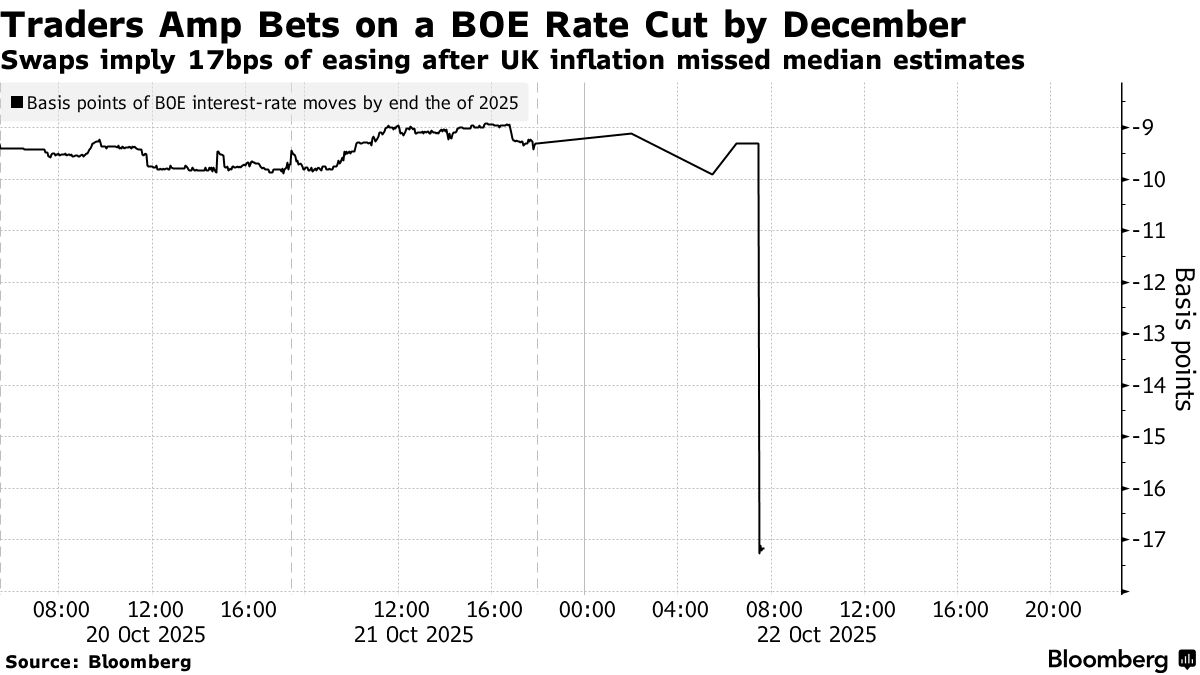 英国9月通胀出人意料地保持稳定,为英国央行进一步降息提供了支持。周三公布的数据显示,英国9月CPI同比上涨3.8%,与前值一致,低于市场预期的 4%;9月核心CPI同比上涨3.5%,低于前值3.6%和市场预期的3.7%。 由于通胀保持稳定,交易员加大了对英国央行降息的押注。货币市场目前预计,英国央行到12月底前将降息17个基点,相当于降息25个基点的可能性约为 70%。而在英国9月CPI数据公布前,货币市场认为英国央行到12月底前降息的几率略高于三分之一。 在降息预期升温的同时,对货币政策敏感的两年期英国国债收益率一度下跌10个基点,至3.75%,为2024年8月以来的最低水平。在两年期英国国债的上涨 的带动下,其他期限英国国债同样上涨。此外,英镑兑美元汇率跌0.4%,至1英镑兑1.3320美元。 | Bonds | Yield | | Day | Month | Year | Date | | --- | --- | --- | --- | --- | --- | --- | | UK 10Y | 4.41 | ▶ | -0.080% | -0.275% | 0.201% | Oct/22 | | UK 1 ...