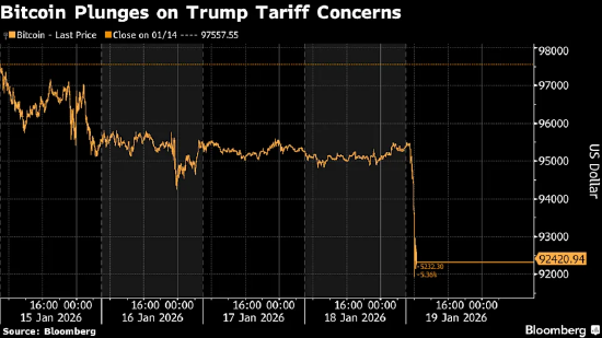 地缘政治事件引发市场避险情绪 - 美国总统特朗普提议对八个欧洲国家加征新进口税 除非达成收购格陵兰岛协议 否则将从2月1日起加征10%进口税 并于6月上调至25% [1][5] - 该言论引发市场避险情绪升温 导致风险资产价格普遍下挫 美股股指期货大幅下挫 黄金和白银等传统避险资产价格飙升至历史新高 [1][5] - 欧洲多国领导人谴责该言论 并准备搁置去年达成的一项贸易协定的审批流程 [3][7] 加密货币市场受冲击表现 - 受整体市场避险情绪影响 加密货币价格大幅跳水 比特币价格跌幅扩大至3.6% 跌破92000美元关口 [1][4] - 其他加密代币跌幅更为显著 全球第二大数字资产以太坊价格下跌4.9% 索拉纳币跌幅达8.6% [1][4] - 此次抛售潮导致加密货币市场总市值蒸发约1000亿美元 [1][4] 过去24小时内约7.9亿美元的加密货币多头头寸被强制平仓 [3][7] 加密货币市场近期行情与分析师观点 - 数字资产在2025年全年走势低迷 但今年年初迎来向好开局 1月14日比特币价格攀升至略低于98000美元水平 多只美国上市的比特币ETF迎来大额资金流入 [3][7] - 对冲基金DACM联合创始人Richard Galvin认为 年初行情是年末税损抛售潮引发市场超卖后 叠加投资者全面止损带来的技术性反弹 最新进口税担忧为反弹踩下刹车 [3][7] - 分析师指出 黄金价格再创历史新高印证此次加密货币抛售更多是市场整体避险情绪升温导致的波动 而非加密货币板块的独立行情 [3][7] - 澳大利亚加密货币交易平台BTC Markets分析师蕾切尔・卢卡斯指出 若当前支撑位失守 交易员预计比特币下一个目标价位将看向90000美元 同时多头认为机构需求有望成为价格的潜在支撑底线 [3][7] 关键价格数据 - 截至伦敦时间清晨6点27分 比特币实时交易价格为92531美元 [4][8]