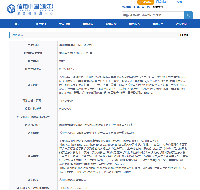 公开资料显示,温州象舞酒业集团有限公司成立于2022-09-06,法定代表人为程琦,注册资本为100000万元,统一社 会信用代码为91330304MABY6BLD0Y,企业注册地址位于浙江省温州市瓯海区娄桥街道集贤路158号1栋2楼1号,所 属行业为零售业。 近日,青田县市场监督管理局对温州象舞酒业集团有限公司作出行政处罚决定,罚款114205元,并没收一批不符合规 定的白酒产品。该处罚决定书文号为青市监处罚﹝2025﹞223号,处罚决定时间为2025年10月17日。 产经新闻爆料电话:0531-85196566 处罚决定书显示,温州象舞酒业集团有限公司经营的白酒产品存在酒精度项目不符合产品标签明示要求的问题,同时 标签内容标注了多个生产厂家和生产地址。这些行为违反了《中华人民共和国食品安全法》第七十一条第一款及第三 款的规定,属于无证照或证照不全从事食品经营的违法行为。 依据《中华人民共和国食品安全法》第一百二十五条第一款第二项及《中华人民共和国行政处罚法》第二十八条的规 定,青田县市场监督管理局责令当事人改正违法行为,并作出减轻处罚决定:罚款114205元;没收纯粮原酿酒506 箱、酱香型白酒(B7)3 ...