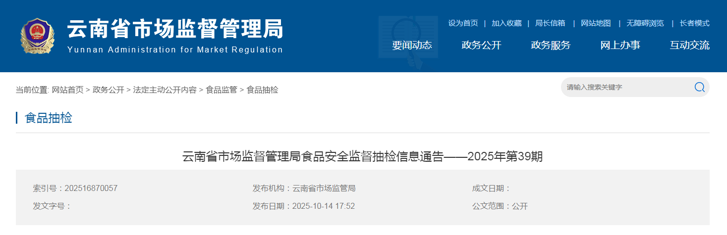 云南省市场监督管理局食品安全监督抽检信息通告2025年第38期