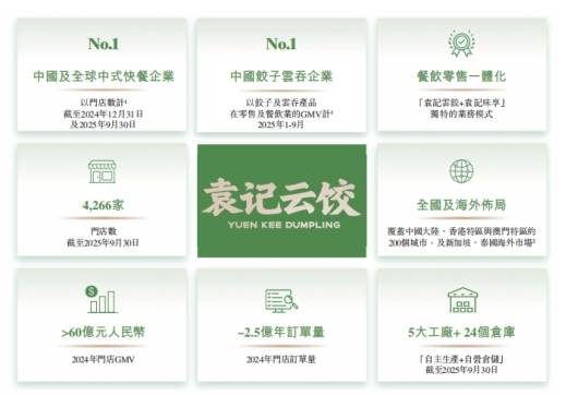 公司概况与市场地位 - 公司是全球门店最多的中式快餐企业,截至2025年9月30日,在全球拥有4266家门店 [1][5] - 公司是中国及全球最大的中式快餐企业(按门店数量计算),同时也是中国最大的饺子云吞企业(按2025年1至9月饺子及云吞产品在零售及餐饮行业的GMV计算) [5] - 公司采用“袁记云饺+袁记味享”双品牌协同,构建“餐饮零售一体化”业务模式 [4] 发展历程与扩张 - 公司成立于2017年4月,从佛山起步,最初注册资本仅10万元 [2] - 2018年门店总数突破100家,苏州工厂投产 [2] - 2021年门店总数突破1000家,成为全国性连锁品牌 [2] - 2023年完成A轮融资,引入黑蚁资本等机构 [2] - 2024年开启全球化,在新加坡开设首家海外门店 [2] - 2025年连续完成B轮及B+轮融资 [3] - 从2023年1月1日至2025年9月30日,门店总数从1990家增至4266家,覆盖中国内地4213家及中国香港、中国澳门及东南亚等市场53家 [6] 业务模式与门店结构 - 核心餐饮品牌“袁记云饺”以加盟模式为主要扩张引擎,截至2025年9月30日,加盟店占比超95% [4][10] - 推出堂食店、生熟外带店、生食外带店三种标准化店型 [4] - 截至2025年9月30日,堂食店有3333家,占总门店数的78.1%;生熟外带店有632家,占14.8%;生食外带店有301家,占7.1% [5] - 门店多集中于社区街道和住宅区等人流量持续且交通便利的区域 [7] - 城市布局上,一线城市有2150家,二线及以下城市有2063家 [6] - 零售品牌“袁记味享”通过超市、即食零售渠道、分销商销售预包装饺子及云吞产品 [5] 财务表现 - 2023年实现收入20.26亿元,2024年增至25.61亿元,同比增长26.4% [6] - 2025年前三季度收入19.82亿元,同比增长11.0% [6] 增长驱动因素 - 加盟模式是公司得以快速规模化的直接原因 [6] - “社区店多”和“手工现包现煮”两大标签是其迅速发展的关键因素 [7] - “手工现包现煮”的产品定位强化了消费者对产品新鲜度的认知 [7] 未来战略与募资用途 - 公司港股IPO募集资金净额将主要用于五大方向:数字化与智能化建设、海外市场拓展及供应链建设、品牌建设与产品研发、供应链升级、补充营运资金及一般企业用途 [11] - 海外市场拓展短期内将重点发展东南亚市场,并探索潜在投资及并购机会 [12] - 计划在海外重点市场建立供应链基础设施,以实现本地化运营 [12] - 公司的使命是“将中国饺子文化带向全世界” [12]