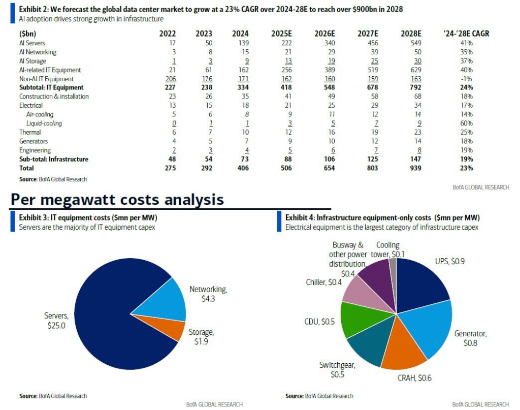 市场概况与增长驱动力 - 人工智能竞赛本质上是关于物理基础设施的竞赛,数据中心是支撑AI运行的万亿级实体产业[1] - 全球数据中心资本支出在2024年突破4000亿美元,预计2025年达到5060亿美元,其中IT设备支出4180亿美元,基础设施支出880亿美元[1] - 在AI需求驱动下,数据中心市场预计在2024至2028年间以23%的年复合增长率扩张,2028年将形成超过9000亿美元的庞大市场[1] - 市场增长主要由超大规模云服务商(如AWS、Azure)和托管公司驱动,自2017年以来其总容量已超越企业自建数据中心[7] - 美洲地区占据全球过半的电力容量,美国北弗吉尼亚州以近15%的全球超大规模数据中心容量成为全球最大单一聚集地,中国北京约占7%[9] 数据中心投资回报模型 - 建设1兆瓦容量数据中心的初始投资约为1300万美元,其中土地电力接入成本200万美元,"动力外壳"成本1100万美元[13] - 每兆瓦每年可产生200万至300万美元租金收入,EBITDA利润率通常达到40%至50%的稳健水平[13] - 在20年持有期和项目融资模型中,典型数据中心的内部收益率可达11.0%,对寻求长期稳定现金流的基础设施投资者极具吸引力[13] - 主要运营成本包括电力(美国工业用电均价约每千瓦时0.08美元)、人力(每兆瓦约2名全职员工)和财产税(约物业价值的1%)[13] 技术密度革命与基础设施挑战 - AI芯片单颗功耗指数级飙升,从英伟达Volta架构到Blackwell架构,单颗GPU功耗在数年间增长4倍,引发服务器机架功率密度急剧攀升[15] - AI训练集群中,标准英伟达Hopper机架功耗达35kW,Blackwell机架高达120kW,计划中的Rubin Ultra平台单机架功耗将达到600kW[17] - 全球仅有5%的现有数据中心平均机架密度能够超过30kW,95%的数据中心无法支持当前AI芯片,必须依赖大规模升级改造和新建[18] - 高密度计算带来的散热挑战是整个AI硬件行业不可逆转的共同趋势,云巨头自研ASIC芯片也纷纷宣布必须采用液冷散热[19] 散热系统变革与竞争格局 - 传统风冷系统散热能力物理极限在每机架60-70kW左右,面对上百千瓦AI机架已无能为力,液冷技术正以无可争议姿态回归主流[21] - 行业主流选择是"芯片级直接液冷"技术,通过金属冷板直接覆盖发热芯片,冷却液分配单元市场2024年规模约12亿美元但正经历爆发式增长[22] - 数据中心运营商对正常运行时间的极致追求使其倾向于选择技术成熟的老牌厂商,维谛、施耐德电气、台达电子和nVent被视为第一梯队领导者[23] - 液冷市场有超过30家供应商,但拥有成熟产品线和全球服务网络的老牌厂商具备天然护城河[23] 供电系统架构革命 - AI机架功率向100kW以上迈进,传统低压交流供电架构弊端尽显,一场向高压直流的架构革命已然开启[25] - 高压直流核心优势在于传输相同功率时可用更细线缆,400V系统相比传统208V交流系统可减少52%的铜线重量[28] - 微软、Meta在开放计算项目中率先提出400V直流方案,英伟达为支持未来百万瓦级服务器机架宣布800V直流方案计划于2027年部署[27] - 英伟达已明确表示其800V直流架构将与维谛、伊顿等行业领导者合作开发,印证在位者在行业标准变革中依然占据核心地位[28] 供应链价值分布与市场规模 - AI数据中心单位建设成本比传统数据中心高33%,从每兆瓦3900万美元跃升至5200万美元,增长来自更昂贵AI服务器和基础设施升级[30] - 散热系统是约100亿美元的市场,维谛是市场份额领导者,江森自控、开利、特灵等传统HVAC巨头也是重要参与者[30] - 供电系统是约180亿美元的市场,施耐德电气占据领先地位,产品线覆盖不间断电源、开关设备、母线槽等,伊顿、ABB、西门子同样是核心玩家[32] - 柴油发电机设备市场规模2024年达到约72亿美元,全球领导者是康明斯,是确保数据中心最高等级可靠性的最后一道防线[36] - 全球服务器市场规模2024年约2800亿美元,其中AI服务器在金额上已占据半壁江山,网络设备市场规模约360亿美元,主要由思科和Arista主导[39]