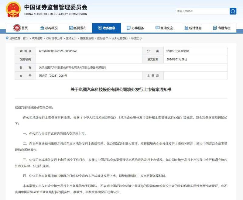 上市进程与资本运作 - 公司以介绍方式在香港联合交易所挂牌上市,已获得中国证监会境外发行上市备案通知书,正式拿到登陆港交所的官方通行证 [1] - 公司上市筹备核心流程耗时不足半年,推进节奏高效:2025年8月东风集团启动方案,9月15日完成股份制改造,10月2日递交上市申请,2026年1月13日获国家发改委等部门批准,1月28日获证监会备案通知 [1] - 本次采用介绍上市方式,不涉及新股发行与募集资金,有利于快速挂牌、避免股权稀释,并与东风集团优化资源配置、重塑估值逻辑的资本战略深度契合 [2] 2026年产品规划与布局 - 公司2026年将推出四款全新车型,包括中国首款量产L3级SUV岚图泰山Ultra、大五座SUV岚图泰山X8、代号为“FE”的全新FUV以及代号为“珠峰”的MPV [2] - 产品以“三王一炸”组合构建差异化矩阵,全系标配L3级智驾硬件,覆盖SUV、MPV、FUV全品类,旨在巩固现有优势并填补细分市场空白 [4] - 具体车型定位:泰山Ultra作为智驾王牌,搭载华为乾崑ADS4四激光方案与800V高压平台,计划于3月开启交付;泰山X8车长5200mm,主打庭院级大五座空间;代号“FE”的FUV瞄准Z世代年轻市场;代号“珠峰”的MPV配备12项黑科技,剑指豪华MPV市场话语权 [4] 技术路线与核心能力 - 公司技术路线为“自研+合作”,一方面通过ESSA智能架构、岚海智混技术构建核心壁垒,已申报2692件专利;另一方面与华为深度合作,快速嫁接顶尖智驾与座舱技术,实现“1+1>2”的效果 [5] - 该模式规避了新势力的技术短板,突破了传统车企的转型瓶颈,为央企新能源转型提供了可借鉴的样本 [5] 全球化布局与品牌影响 - 公司产品已出口40余个国家,深耕欧洲市场并通过欧盟严苛认证,梦想家等车型斩获国际设计大奖 [5] - 港股上市后,公司的国际品牌影响力预计将进一步提升,有助于其在全球高端新能源市场竞争中占据更有利位置 [5] 市场战略与竞争定位 - 公司正以“资本筑底+产品亮剑”的双重姿态,向高端新能源市场发起强势冲击 [1] - 公司兼具体系优势与技术活力,正以稳健而坚定的步伐,重塑高端新能源市场的竞争格局 [7]