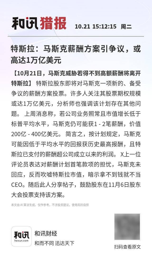 【10月21日,马斯克威胁若得不到高额薪酬将离开特斯拉】特斯拉股东即将对马斯克一项新的、备受争 议的薪酬方案投票。许多人关注其股票期权规模或达1万亿美元,分析师也强调该计划存在其他问题。 上周消息称,若公司业务照常且市值增长低于标普平均水平,马斯克仍可能获1 - 2笔薪酬,价值200亿 - 400亿美元。 简言之,按计划规定,马斯克可能因低于平均水平的回报获历史最高报酬,且特斯拉已支 付的薪酬超公司成立以来的利润。 X上一位评论员表达对薪酬计划首笔款项的担忧,马斯克未回应,反 而吹嘘特斯拉市值,暗示拿不到钱就不当CEO。随后此人分享帖子,鼓励股东在11月6日股东大会投票 支持该方案。 本文由 AI 算法生成,仅作参考,不涉投资建议,使用风险自担 本文由 Al 算法生成,仅作参考,不涉投资建议,使用风险自担 和讯财经 FUL hexun.con 和而不同 迅达天下 扫码查看原文 ...