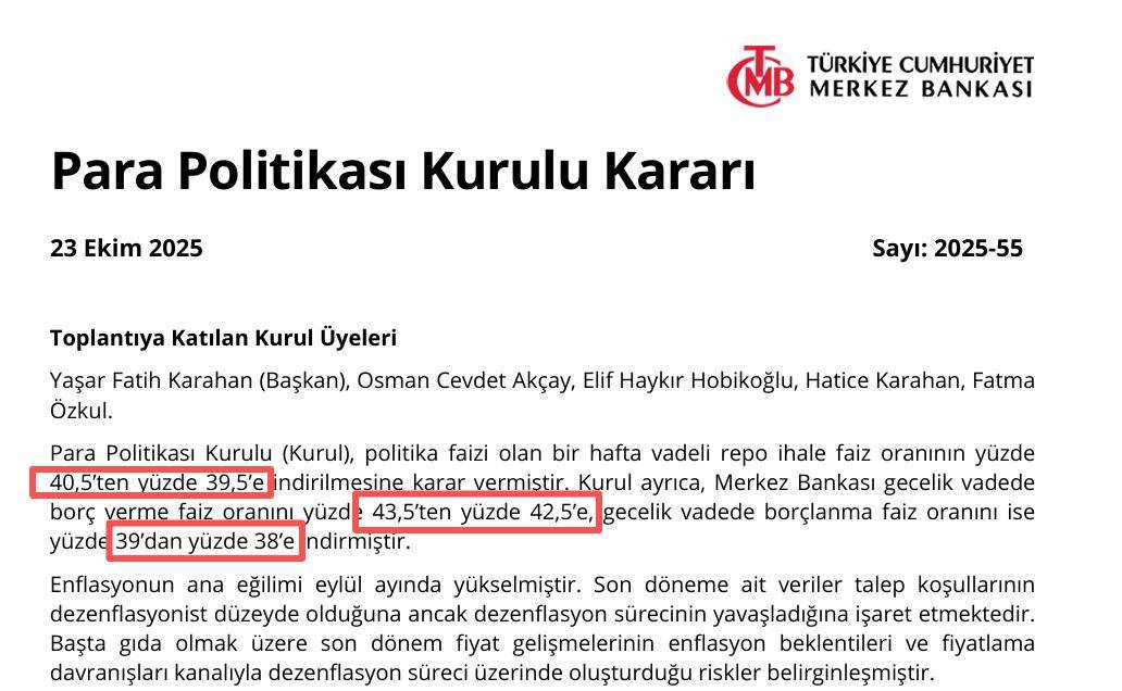 中国基金报记者 晨曦 大家好!一起来关注近期海外央行的降息情况。 10月23日,土耳其央行货币政策委员会(MPC)宣布,将政策利率(即一周回购利率)从40.5%下调至39.5%。委员会还将央行隔夜贷款利率从 43.5%下调至42.5%,将隔夜借款利率从39%下调至38%。 此次土耳其央行将政策利率下调100个基点,符合市场预期。消息发布后,土耳其主要银行指数由涨转跌。 土耳其央行在声明中指出,9月份通胀的潜在趋势有所上升。尽管需求状况显示通缩压力,但近期数据表明通缩步伐放缓且食品价格风险上升。 在实现价格稳定之前,货币政策委员会将持续采取紧缩货币政策立场。声明提及,若信贷和存款市场出现预期外的发展,货币传导机制将通过额外 的宏观审慎步骤予以支持。委员会将通过透明且数据驱动的方式严格管理流动性条件,以实现5%的中期通胀目标。 土耳其央行数据显示,截至10月17日当周,外国投资者增持1.511亿美元土耳其国债,外国投资者持有的土耳其股票资金流出1.78亿美元。 另外,土耳其10月消费者信心指数从前月的83.9点降至83.6点,创下自7月以来最低水平,主要因家庭对当前财务状况的评估略有恶化。消费者对未 来12个月耐 ...