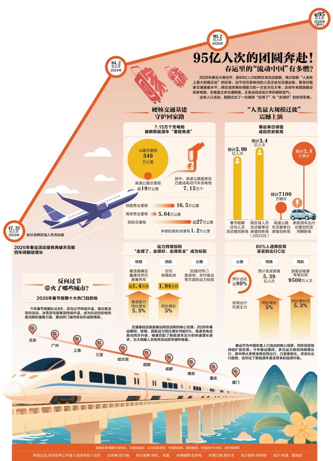 2026年春运出行需求与铁路客运表现 - 2026年春运期间“反向过年”机票预订量同比增长84%,一线和新一线城市最为热门[1] - 2026年春运全社会跨区域人员流动量预计将达95亿人次,创历史新高[1] - 2025年国家铁路完成旅客发送量42.55亿人次,同比增长4.2%,全国铁路高峰日旅客发送量达2313.2万人次,再创历史新高[5] 全国多地铁路春运客流创新高 - 长三角地区:上海铁路局预计2026年春运发送旅客首次突破1亿人次,达1.03亿人次,日均257.5万人次,较去年春运增长4%[8] - 京津冀地区:国铁北京局预计2026年春运发送旅客4147万人次,较2025年增加99.3万人次,增幅2.5%;北京地区预计发送旅客1994.7万人次,较2025年增加39.2万人次,增幅2%[8][9] - 粤港澳大湾区:春运前3天,国铁广州局累计发送旅客561.5万人次,日均187.1万人次;广东地区累计发送旅客391.6万人次[9] - 深圳铁路部门预计2026年春运发送旅客1213.5万人次,日均30.34万人次,同比增长7.5%;预计节前最高峰日(2月7日)发送旅客将达42.1万人次[9] 高铁网络建设与区域协同发展 - 广湛高铁正式接入广州中心城区,湛江至汕头最快运行时间缩短至4小时27分钟,强化粤港澳大湾区与粤东、粤西的直连[11] - 汕汕高铁开通后,广州东至汕头最快约110分钟,深圳至汕头最快99分钟可达,推动粤东“2小时生活圈”成型[11] - 广深港高铁2025年累计运送旅客3579.4万人次,同比增加541.6万人次、增长17.8%,创历史新高;自开通至今累计客流已突破1亿人次[12] - 长三角铁路营业总里程已超1.5万公里,其中高铁里程超过7700公里[12] - 沪宁沿江高铁将句容、金坛等7个经济强县(区)纳入沪宁“一小时交通圈”[12] - 杭温高铁开通一周年累计安全运送旅客逾1600万人次,日均逾4.4万人次[13] 高铁对地方经济与产业的拉动效应 - 高铁网络激活了沿线旅游、餐饮等线下消费场景,加速了人才、资金、技术的跨区域高效流动[5] - 汕汕高铁开通后,汕头南澳岛、小公园开埠区等文旅地标客流明显提升,并为汕头纺织服装、玩具制造等特色产业链接大湾区市场创造条件[11][12] - 广深港高铁围绕大型活动动态优化运力,2025年累计开行香港跨境旅游列车30趟,发送旅客1.9万人次[12] - 杭温高铁横店站启用一年来累计发送旅客近140万人次,直接带动前往横店影视城的客流;桐庐的文旅景点游客数量也大幅增长[14] - “高铁+文旅”模式不断成熟,2026年长三角首趟旅游列车(影视旅游列车)已从苏州南站发往横店[14]