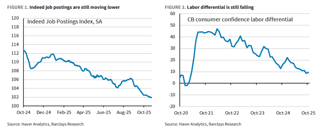 巴克莱对美联储政策的解读 - 市场对鲍威尔言论的鹰派解读可能是一次误判 其真正意图是纠正市场对降息已确定的过度自信 [1] - 鲍威尔在10月FOMC会议上表示通胀有上行压力 就业有下行风险 12月降息并非板上钉钉且委员会存在分歧 [1] - 巴克莱认为这是一种沟通策略 旨在打破市场认为无论数据如何降息都已是定局的假设 [1][2] 经济数据支持降息的理由 - 劳动力市场需求持续放缓 先行指标如Indeed招聘职位和劳动差额均显示此趋势 [3] - 鲍威尔承认近期通胀数据疲软 核心通胀指标已显露下行趋势 [5] - 剔除关税影响后 市场基础的核心PCE通胀已接近2%的目标 [5] 当前货币政策评估与市场定价 - 巴克莱分析指出 若潜在通胀仅比目标高出零点几个百分点且失业率接近自然失业率 则政策设定应为中性 限制性政策已无必要 [8] - 市场目前定价过于鹰派 预期到2026年6月累计降息55个基点至3.3% 未能充分反映劳动力市场大幅走弱及新主席更鸽派的风险 [8][10] - 期权市场隐含分布显示 对2026年3月和6月的降息次数存在分歧 模态预期是到6月仅降息一次 [10]