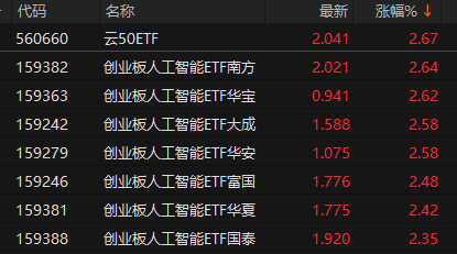 10月28日,ETF午间收盘涨跌不一。云50ETF(560660)上涨2.67%、创业板人工智能ETF南方 (159382)上涨2.64%、创业板人工智能ETF华宝(159363)上涨2.62%、创业板人工智能ETF大成 (159242)上涨2.58%、创业板人工智能ETF华安(159279)上涨2.58%。黄金基金ETF(159812)下跌 2.26%、黄金ETFAU(518860)下跌2.25%。 上证报中国证券网讯 10月28日,ETF午间收盘涨跌不一。云50ETF(560660)上涨2.67%、创业板人工 智能ETF南方(159382)上涨2.64%、创业板人工智能ETF华宝(159363)上涨2.62%、创业板人工智能 ETF大成(159242)上涨2.58%、创业板人工智能ETF华安(159279)上涨2.58%。黄金基金ETF (159812)下跌2.26%、黄金ETFAU(518860)下跌2.25%。 | 代码 | 名称 | | 器幅% ↑ | | --- | --- | --- | --- | | 560660 | 250ETF | 2.041 | 2.67 | | 159382 | 创业 ...