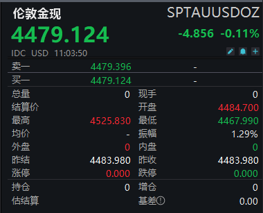 现货黄金价格动态 - 截至12月24日发稿,现货黄金价格报4479.124美元/盎司,较前下跌0.11% [1] - 当日早间,现货黄金价格一度涨超4500美元/盎司,最高触及4525.83美元/盎司,刷新历史新高 [2] - 当日开盘价为4484.700美元/盎司,最低价为4467.990美元/盎司,价格振幅为1.29% [2] 市场交易数据 - 伦敦金现(SPTAUUSDOZ)报价为4479.124美元/盎司,下跌4.856美元,跌幅0.11% [2] - 前一交易日结算价为4483.980美元/盎司 [2]