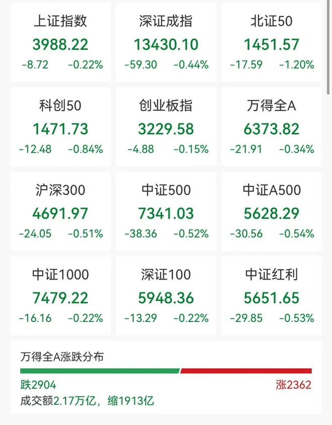 记者丨黎雨桐 见习记者林健民 编辑丨曾静娇 10月28日,A股市场冲高回落,沪指盘中突破4000点大关,再创十年新高,创业板指一度涨超1%。截至收盘,三大指数集体收跌。沪深两市成 交额2.17万亿,较上一个交易日缩量1913亿。 | 上证指数 | 深证成指 | 北证50 | | --- | --- | --- | | 3988.22 | 13430.10 | 1451.57 | | -8.72 -0.22% -59.30 -0.44% -17.59 -1.20% | | | | 科创50 | 创业板指 | 万得全A | | 1471.73 | 3229.58 | 6373.82 | | -12.48 -0.84% -4.88 -0.15% -21.91 -0.34% | | | | 沪深300 | 中证500 | 中证A500 | | 4691.97 | 7341.03 | 5628.29 | | -24.05 -0.51% -38.36 -0.52% -30.56 -0.54% | | | | 中证1000 | 深证100 | 中证红利 | | 7479.22 | 5948.36 | 5651.65 | | ...